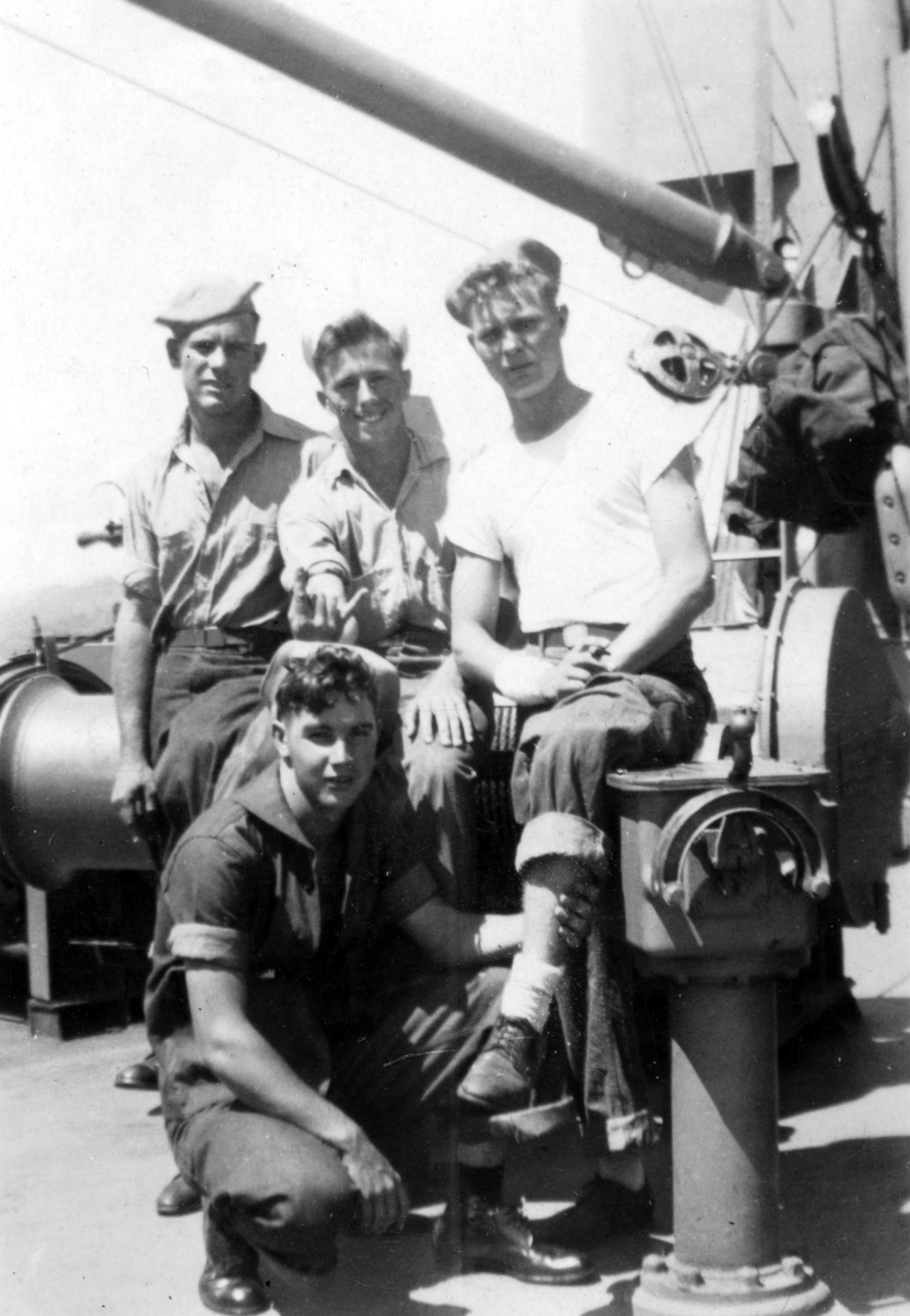 Four unidentified WWII sailors on board a ship, possibly the USS Blue Ridge.