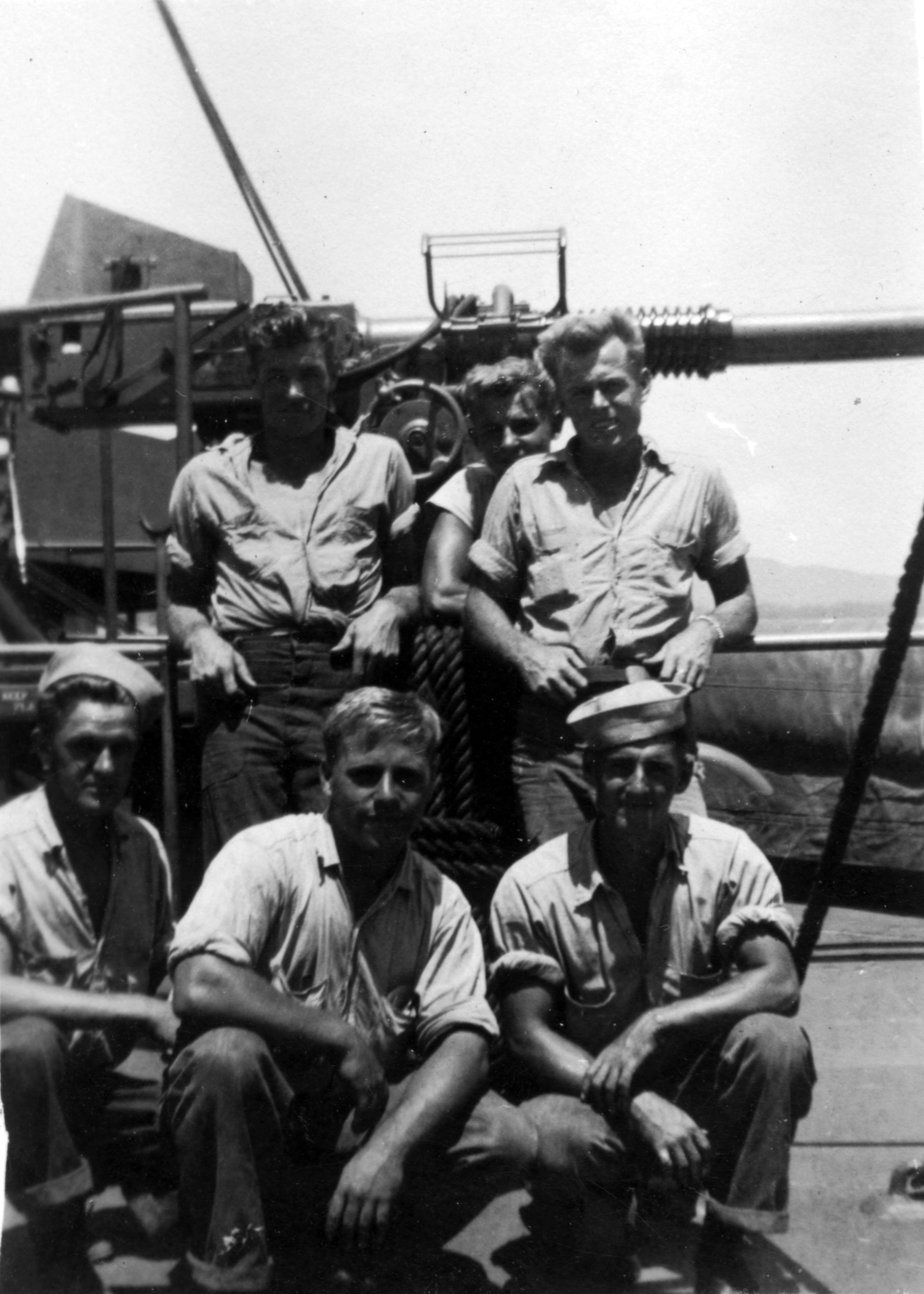 Six unidentified WWII sailors aboard a ship, probably the USS Blue Ridge.