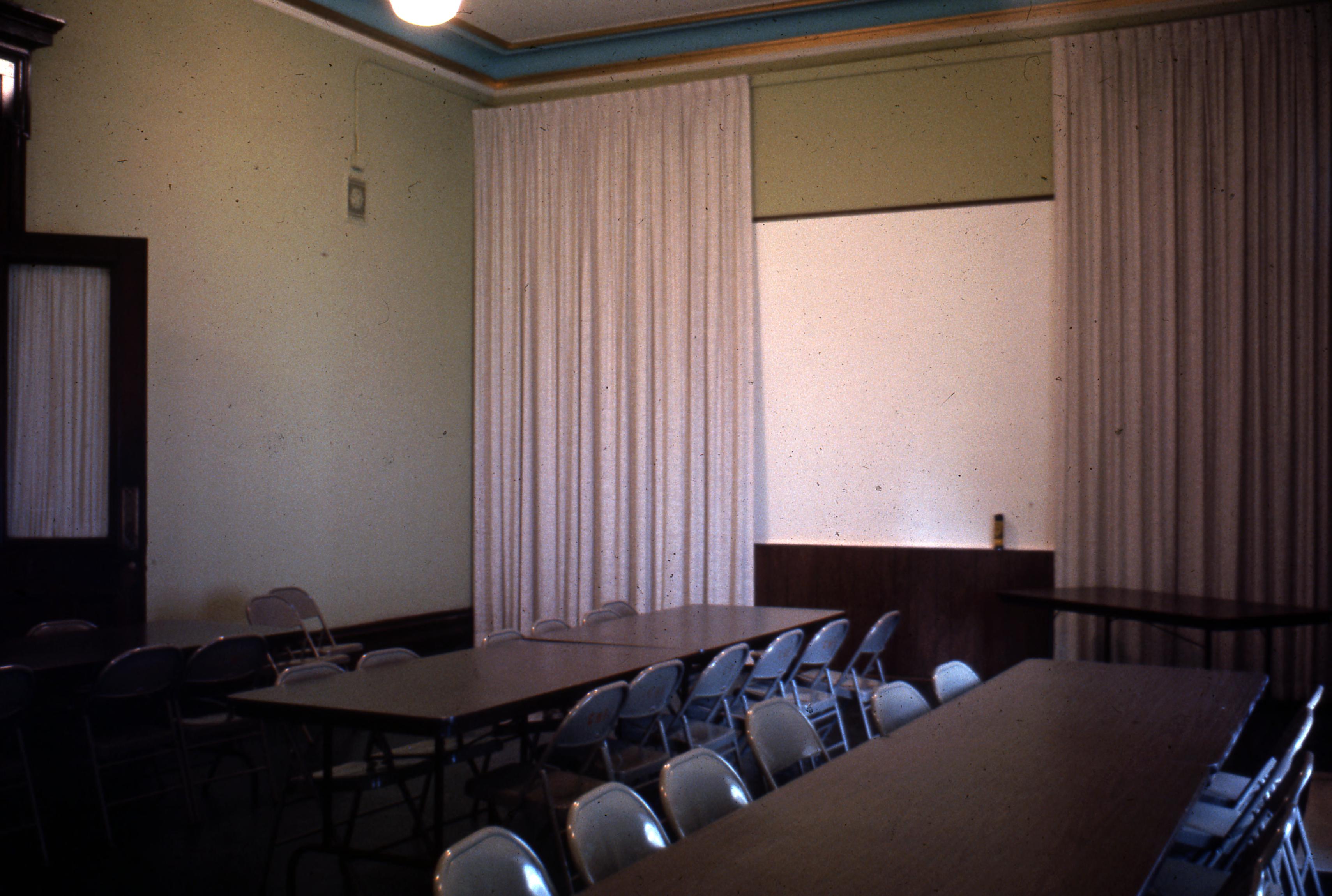 Meeting room in the old Vanderburgh County Courthouse. The old Vanderburgh County Courthouse, a Beaux Arts structure was designed by Henry Wolters of Louisville, KY. Construction began in 1888 and was completed by 1890, with offices moving in early in 1891. It occupies the block bounded by 4th, Vine, 5th, and Court streets, an area that was once a turnaround basin for the Wabash and Erie Canal. The building still stands, although it has not served as a Courthouse since 1969.