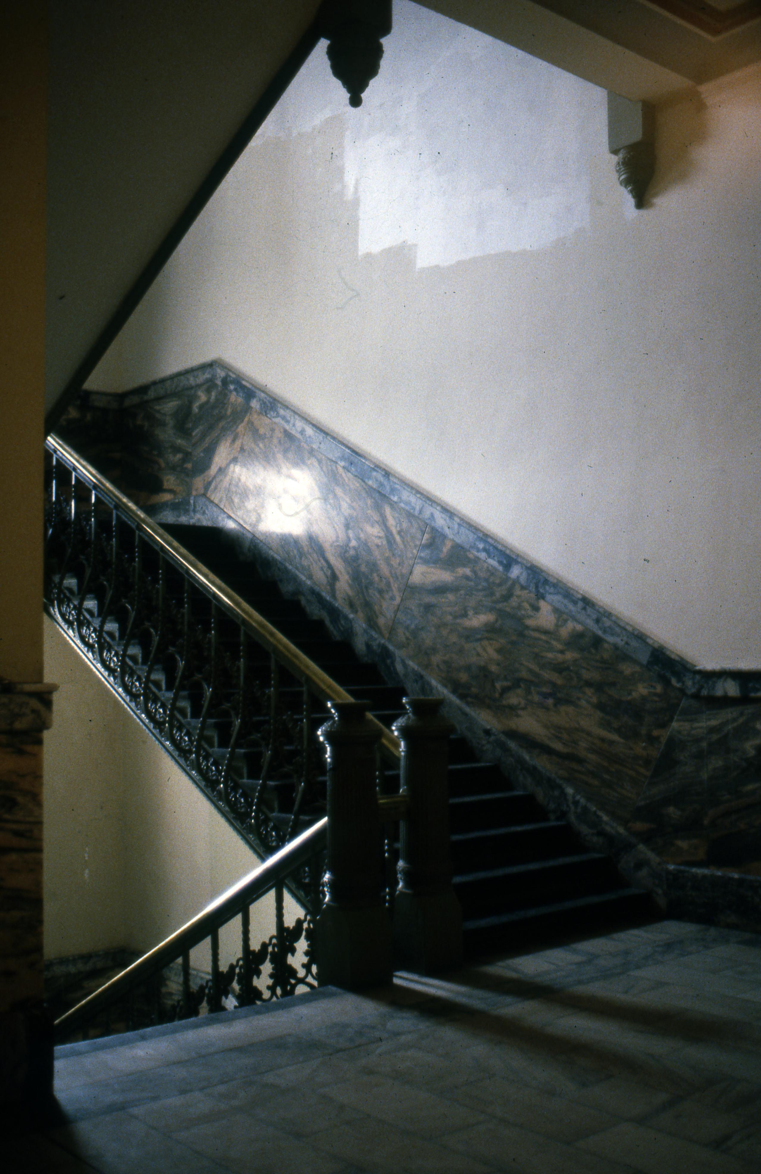 Looking up an interior stair house at the old Vanderburgh County Courthouse. The old Vanderburgh County Courthouse, a Beaux Arts structure was designed by Henry Wolters of Louisville, KY. Construction began in 1888 and was completed by 1890, with offices moving in early in 1891. It occupies the block bounded by 4th, Vine, 5th, and Court streets, an area that was once a turnaround basin for the Wabash and Erie Canal. The building still stands, although it has not served as a Courthouse since 1969.