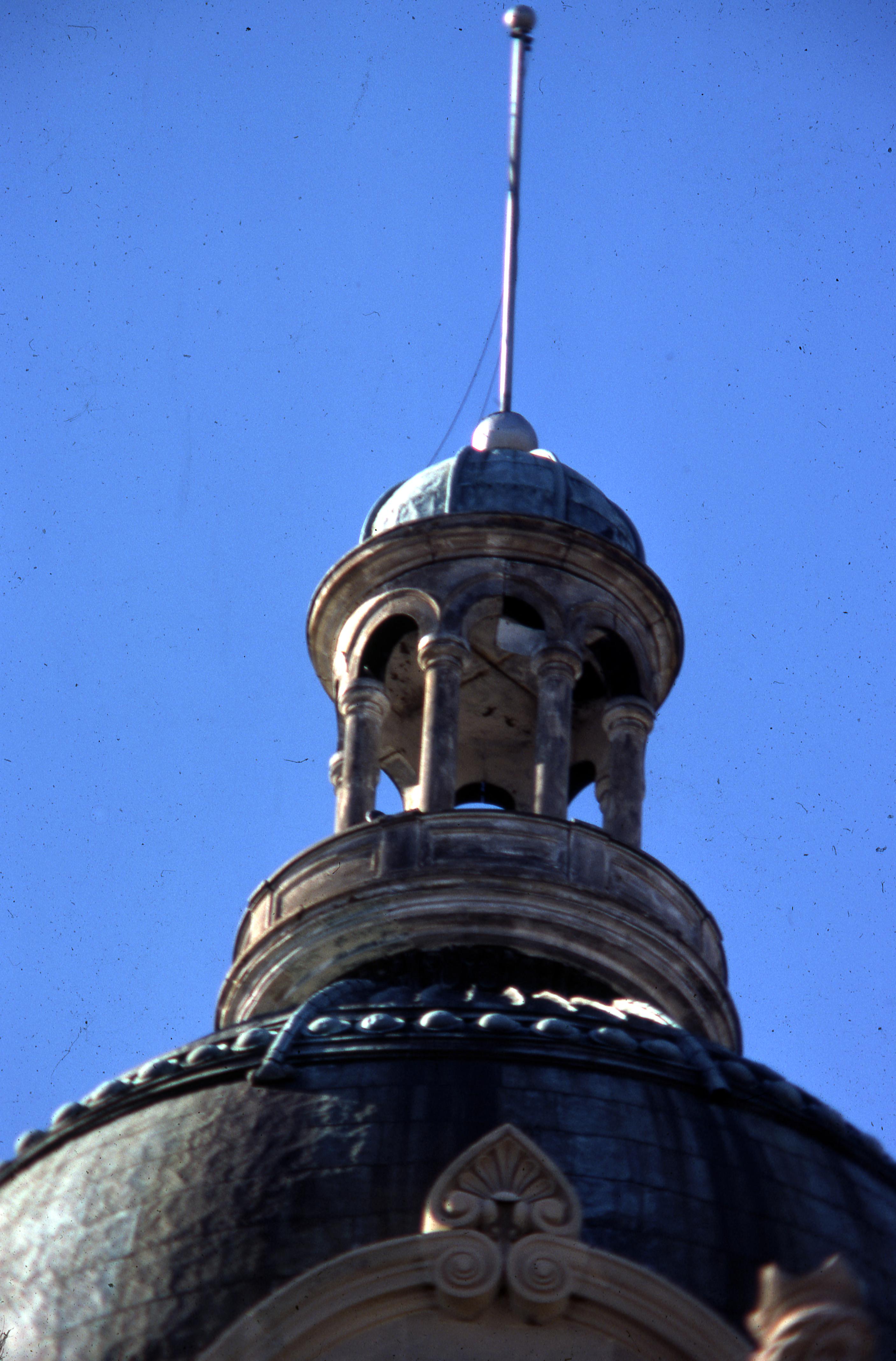 Top of the Vanderburgh County Courthouse cupola. This Vanderburgh County Courthouse at 201 NW 4th St. was completed in 1890. The building still stands, but is now referred to as the old Courthouse, as government offices moved into another building in 1969. (It would not have served as a Courthouse at the time of this photograph.) The Courthouse spans the block between NW 4th St. and NW 5th St., bounded by Vine St. and Court St. The bell tower, as unique as the statues and carvings on the exterior of the building, rises above the Old Courthouse to a height of approximately 190 feet. The first level of the tower is enclosed but surrounded with windows which allow an abundance of sunlight to enter. The next level is open and houses the 4500 pound Old Courthouse bell. The bell, manufactured by McShane Bell Foundry located in Baltimore, Maryland, has tolled at the Old Courthouse since August 20, 1890. The next level is enclosed and houses only the pulleys and inner workings of the clock. The four faces of the clock, each measuring seven and one-half feet in diameter with one facing each side of the building, are found on the final level of the tower. Finally, found on this level of the tower is a suspended staircase which winds to the top of the copper-clad central dome of the Old Courthouse; the base of the cupola sits atop the dome. The Courthouse sits on ground that was once the turnaround for the Wabash and Erie Canal.