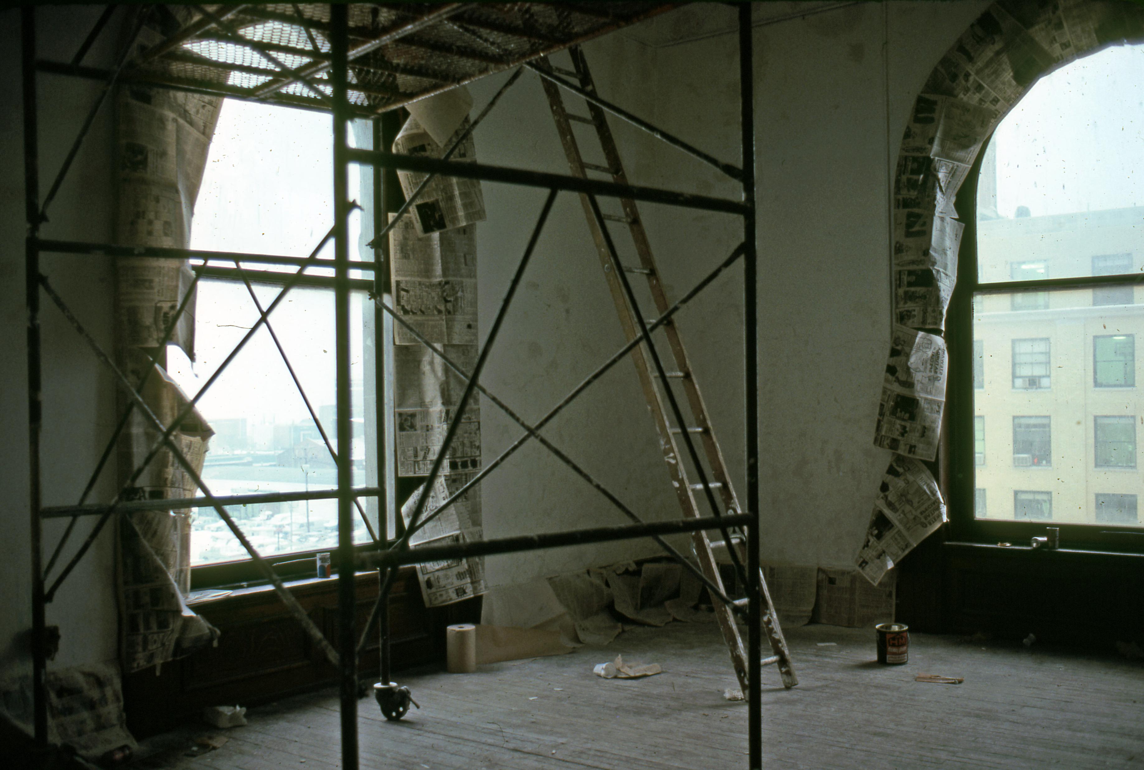 Vanderburgh County Courthouse remodeling, here there is scaffolding near windows.
