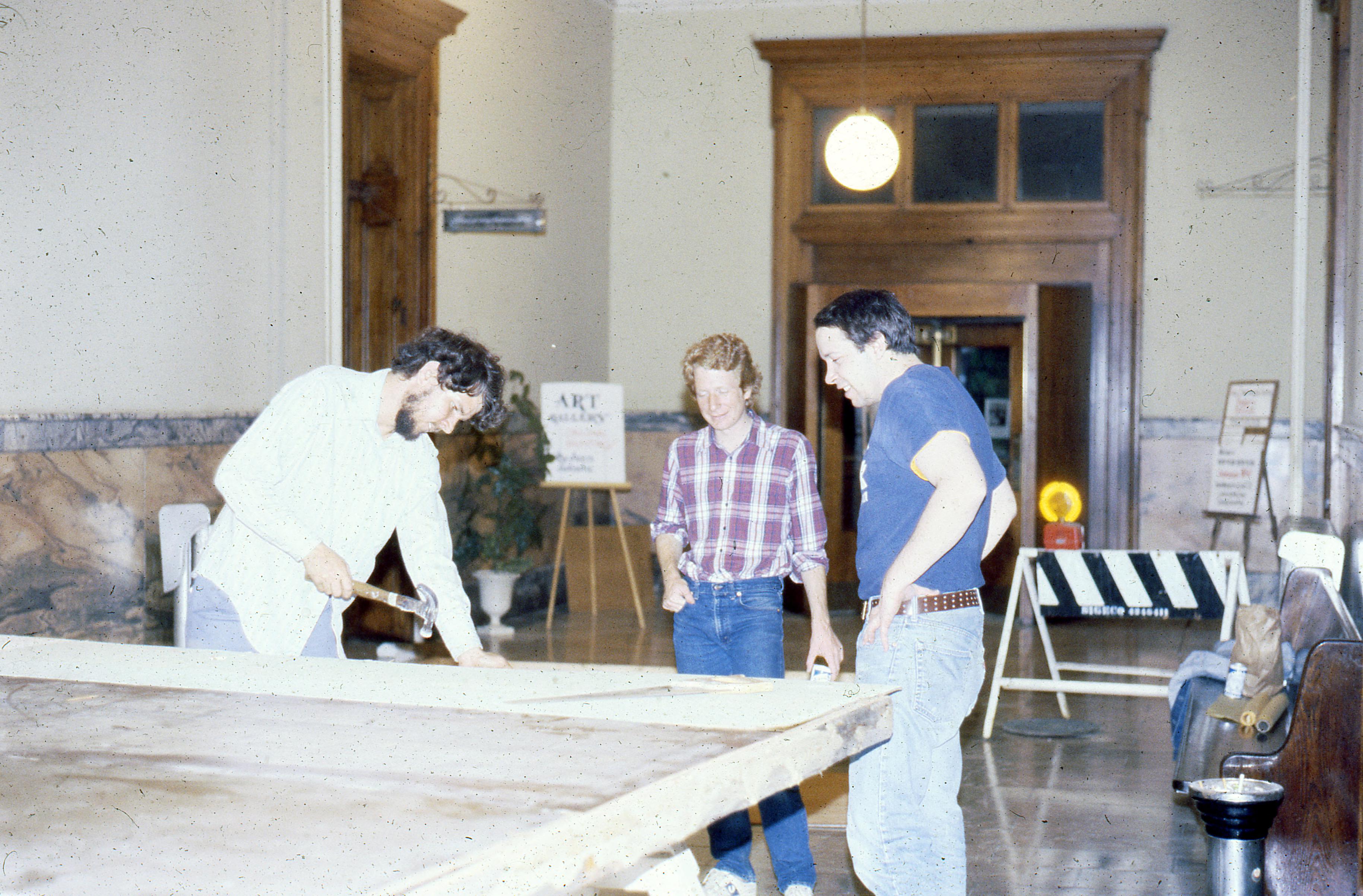 Unidentified man working on remodeling the Vanderburgh County Courthouse, while 2 others watch. This Vanderburgh County Courthouse at 201 NW 4th St. was completed in 1890. The building still stands, but is now referred to as the old Courthouse, as government offices moved into another building in 1969. The Courthouse spans the block between NW 4th St. and NW 5th St., bounded by Vine St. and Court St. The Courthouse sits on ground that was once the turnaround for the Wabash and Erie Canal. This is the NW 4th St. side, with the Soldiers and Sailors Memorial Coliseum in the background.