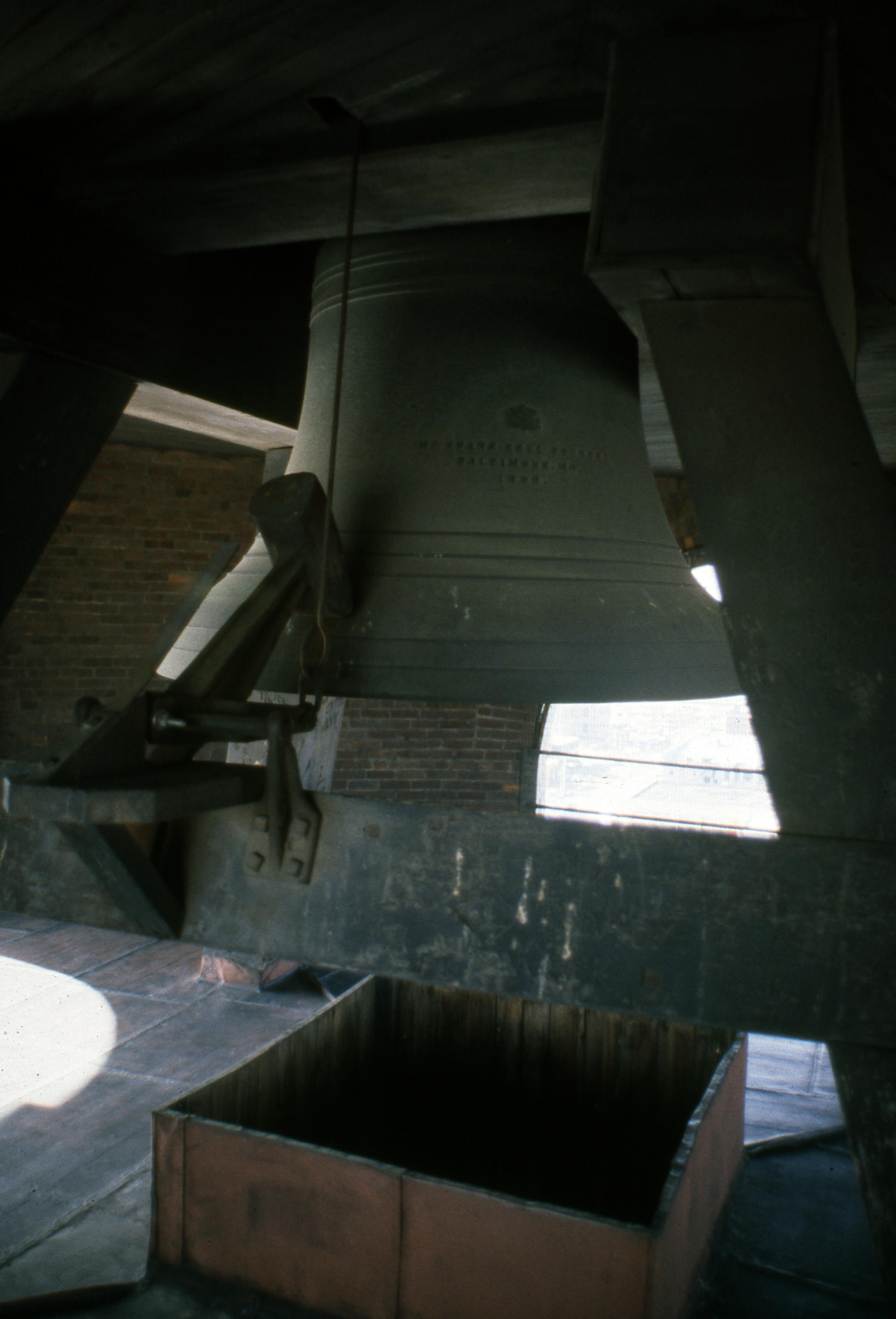 Vanderburgh County Courthouse bell. Restoration of the bell and tower was completed by William Eric Leth and Keith G. Benedict of the University of Southern Indiana as a gift to the city of Evansville, Indiana December 24, 1985. Located at 201 NW 4th St., the Courthouse was completed in 1890. The building still stands, but is now referred to as the old Courthouse, as government offices moved into another building in 1969. (It would not have served as a Courthouse at the time of this photograph.) The Courthouse spans the block between NW 4th St. and NW 5th St., bounded by Vine St. and Court St. The bell tower, as unique as the statues and carvings on the exterior of the building, rises above the Old Courthouse to a height of approximately 190 feet. The first level of the tower is enclosed but surrounded with windows which allow an abundance of sunlight to enter. The next level is open and houses the 4500 pound Old Courthouse bell. The bell, manufactured by McShane Bell Foundry located in Baltimore, Maryland, has tolled at the Old Courthouse since August 20, 1890. The next level is enclosed and houses only the pulleys and inner workings of the clock. The four faces of the clock, each measuring seven and one-half feet in diameter with one facing each side of the building, are found on the final level of the tower. Finally, found on this level of the tower is a suspended staircase which winds to the top of the copper-clad central dome of the Old Courthouse; the base of the cupola sits atop the dome. The Courthouse sits on ground that was once the turnaround for the Wabash and Erie Canal.