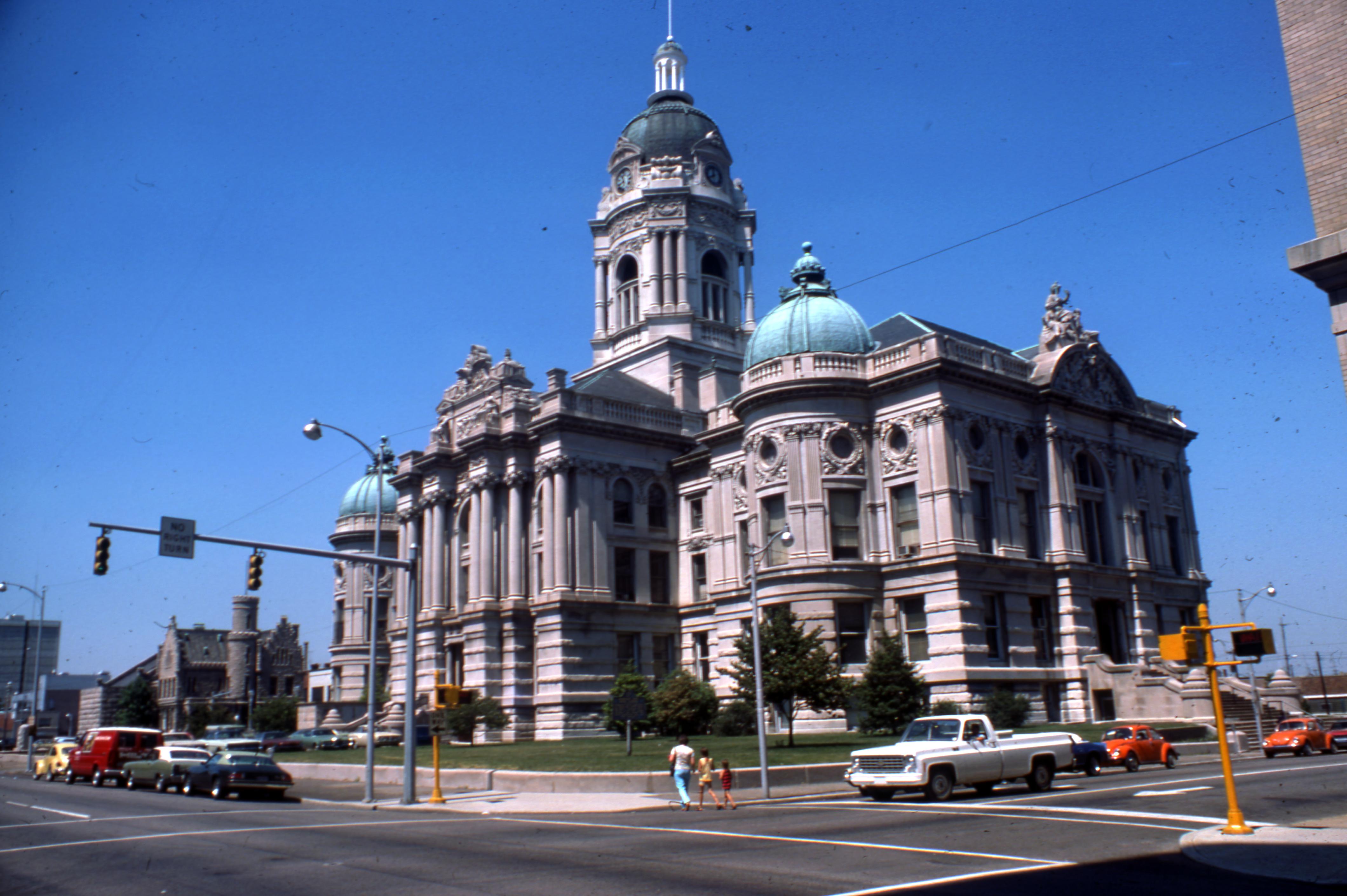 The old Vanderburgh County Courthouse, a Beaux Arts structure was designed by Henry Wolters of Louisville, KY. Construction began in 1888 and was completed by 1890, with offices moving in early in 1891. It occupies the block bounded by 4th, Vine, 5th, and Court streets, an area that was once a turnaround basin for the Wabash and Erie Canal. The building still stands, although it has not served as a Courthouse since 1969. In this view, to the left is Vine St., and to the right, N.W. 5th St.