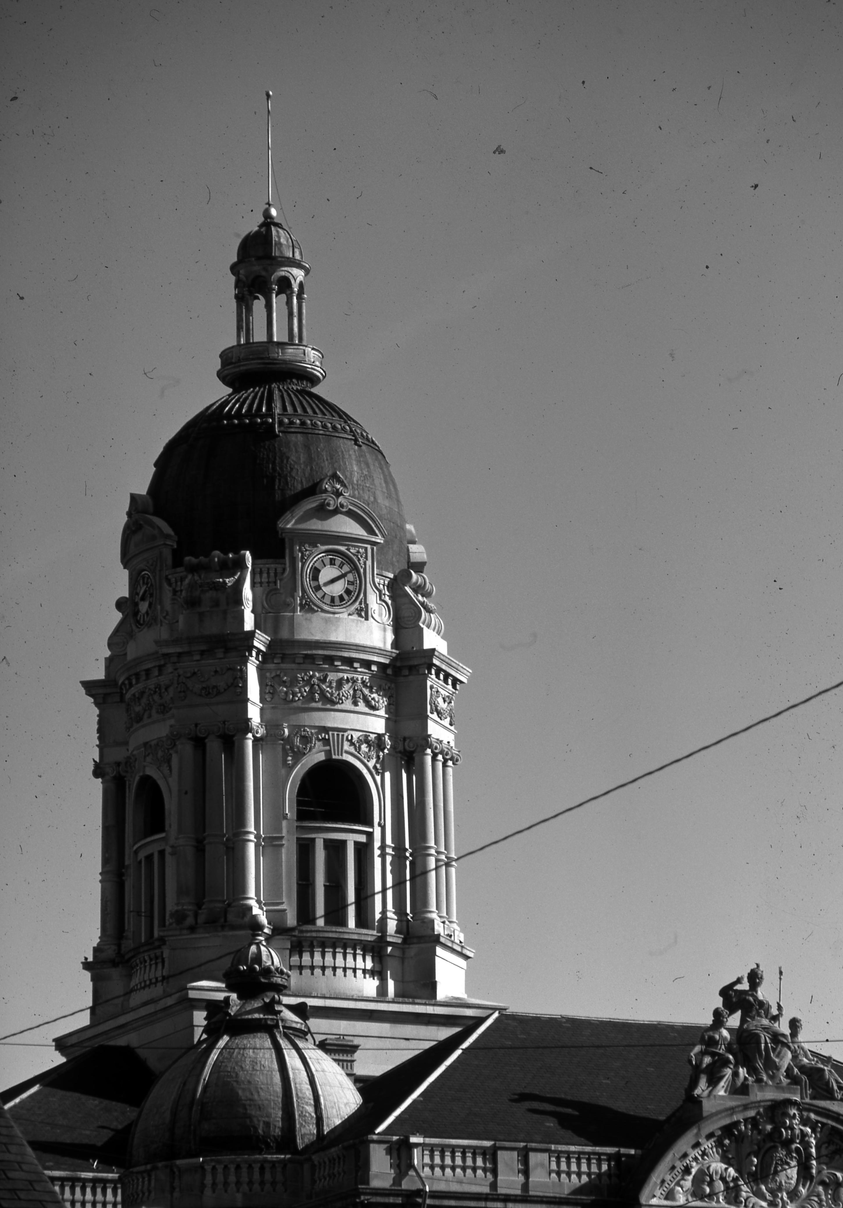 This Vanderburgh County Courthouse at 201 NW 4th St. was completed in 1890. The building still stands, but is now referred to as the old Courthouse, as government offices moved into another building in 1969. (It would not have served as a Courthouse at the time of this photograph.) The Courthouse spans the block between NW 4th St. and NW 5th St., bounded by Vine St. and Court St. The bell tower, as unique as the statues and carvings on the exterior of the building, rises above the Old Courthouse to a height of approximately 190 feet. The first level of the tower is enclosed but surrounded with windows which allow an abundance of sunlight to enter. The next level is open and houses the 4500 pound Old Courthouse bell. The bell, manufactured by McShane Bell Foundry located in Baltimore, Maryland, has tolled at the Old Courthouse since August 20, 1890. The next level is enclosed and houses only the pulleys and inner workings of the clock. The four faces of the clock, each measuring seven and one-half feet in diameter with one facing each side of the building, are found on the final level of the tower. Finally, found on this level of the tower is a suspended staircase which winds to the top of the copper-clad central dome of the Old Courthouse, the base of the cupola sits atop the dome. The Courthouse sits on ground that was once the turnaround for the Wabash and Erie Canal.