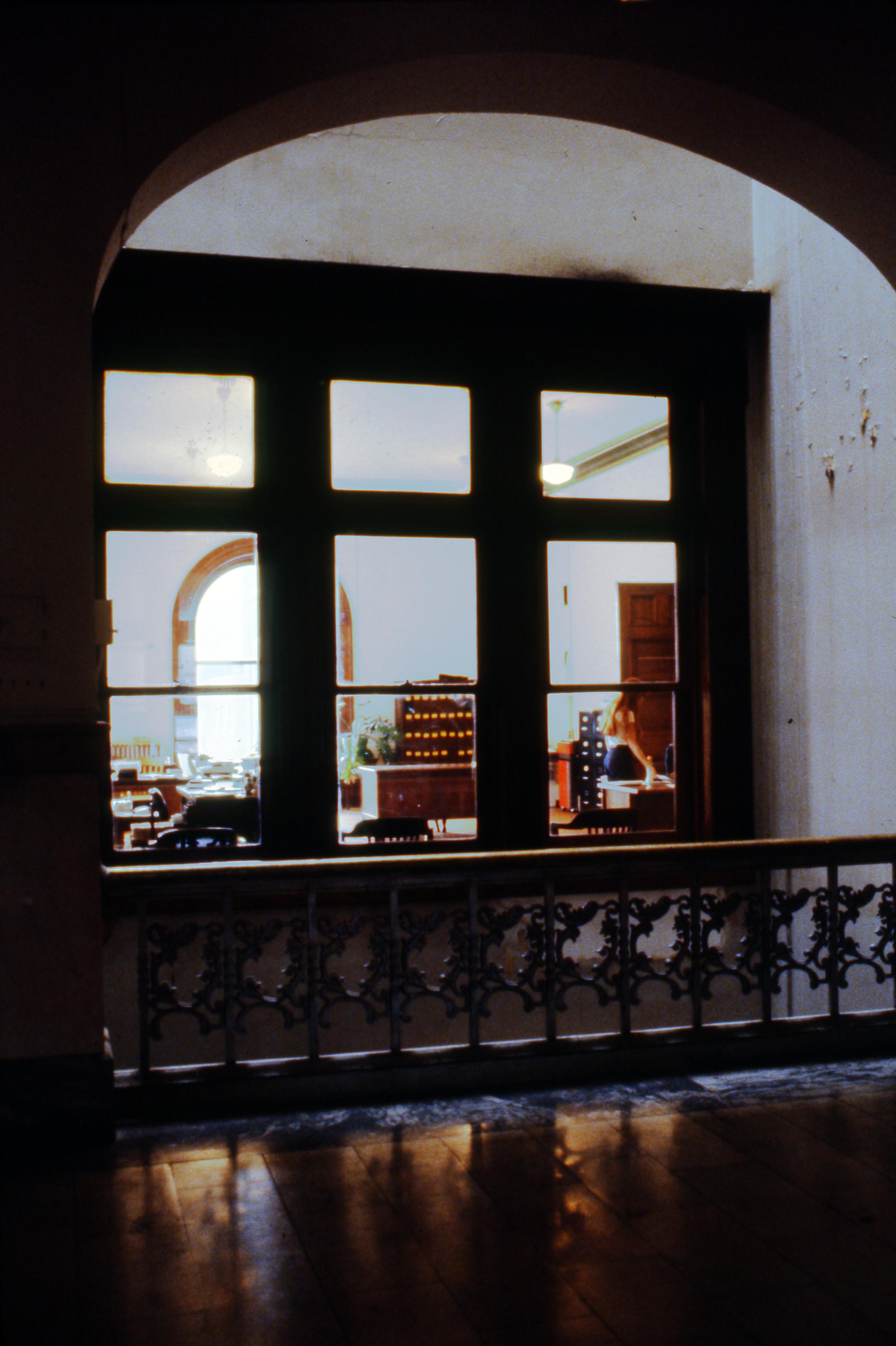 Looking through an archway into an office in the old Vanderburgh County Courthouse. The old Vanderburgh County Courthouse, a Beaux Arts structure was designed by Henry Wolters of Louisville, KY. Construction began in 1888 and was completed by 1890, with offices moving in early in 1891. It occupies the block bounded by 4th, Vine, 5th, and Court streets, an area that was once a turnaround basin for the Wabash and Erie Canal. The building still stands, although it has not served as a Courthouse since 1969.