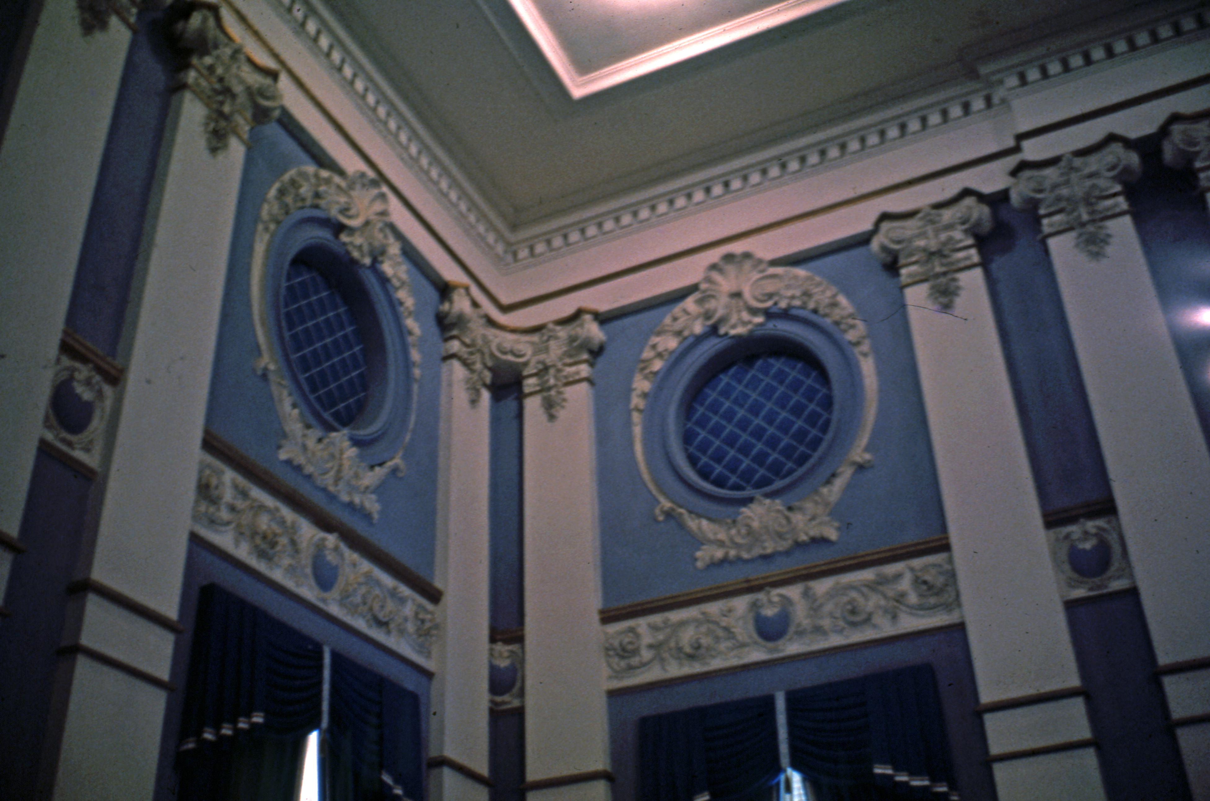 Vanderburgh County Courthouse, Blue Room, contemporary pictures show a room looking like this, but painted green. It is a ball room. Whether or not there are 2 such rooms is unclear. The old Vanderburgh County Courthouse, a Beaux Arts structure was designed by Henry Wolters of Louisville, KY. Construction began in 1888 and was completed by 1890, with offices moving in early in 1891. It occupies the block bounded by 4th, Vine, 5th, and Court streets, an area that was once a turnaround basin for the Wabash and Erie Canal. The building still stands, although it has not served as a Courthouse since 1969.