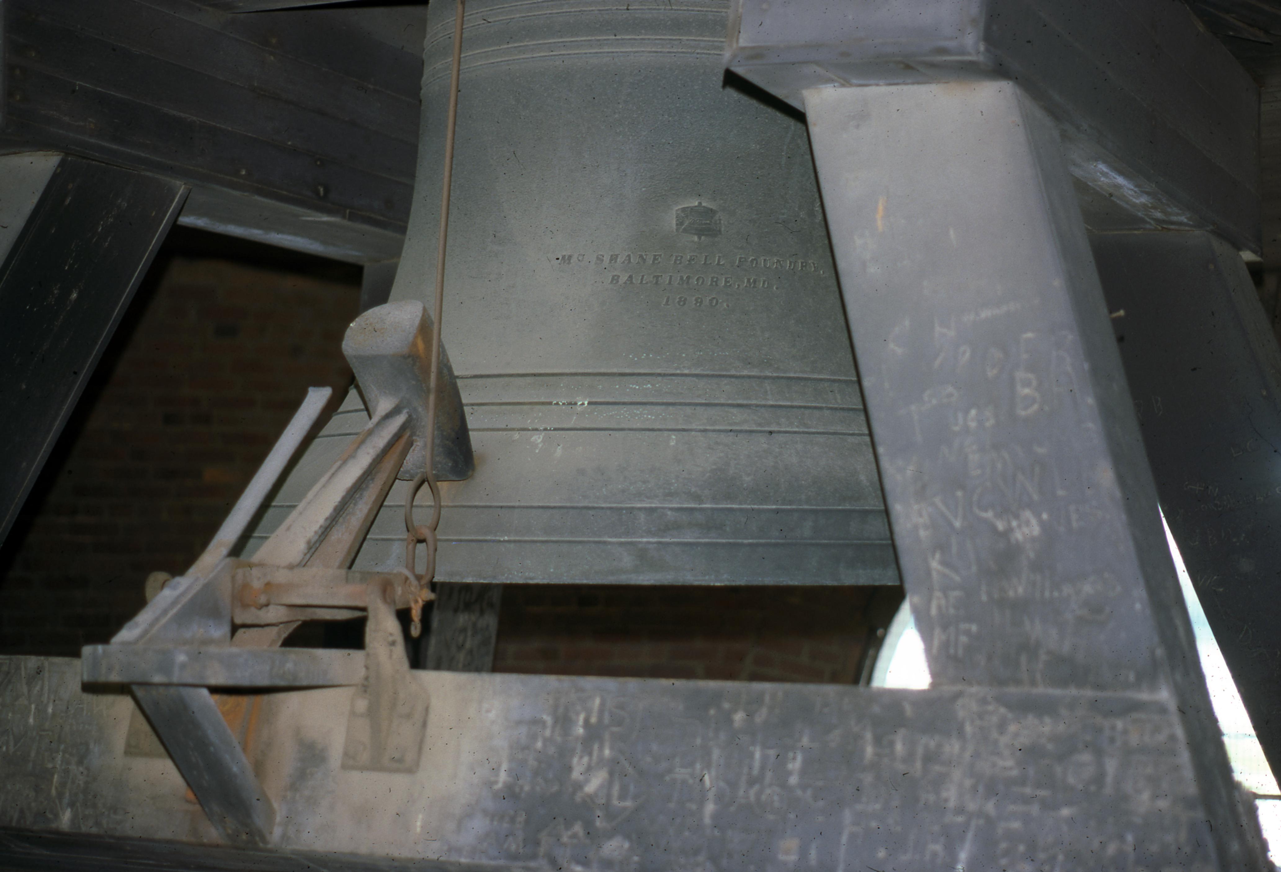 Vanderburgh County Courthouse bell. Restoration of the bell and tower was completed by William Eric Leth and Keith G. Benedict of the University of Southern Indiana as a gift to the city of Evansville, Indiana December 24, 1985. Located at 201 NW 4th St., the Courthouse was completed in 1890. The building still stands, but is now referred to as the old Courthouse, as government offices moved into another building in 1969. (It would not have served as a Courthouse at the time of this photograph.) The Courthouse spans the block between NW 4th St. and NW 5th St., bounded by Vine St. and Court St. The bell tower, as unique as the statues and carvings on the exterior of the building, rises above the Old Courthouse to a height of approximately 190 feet. The first level of the tower is enclosed but surrounded with windows which allow an abundance of sunlight to enter. The next level is open and houses the 4500 pound Old Courthouse bell. The bell, manufactured by McShane Bell Foundry located in Baltimore, Maryland, has tolled at the Old Courthouse since August 20, 1890. The next level is enclosed and houses only the pulleys and inner workings of the clock. The four faces of the clock, each measuring seven and one-half feet in diameter with one facing each side of the building, are found on the final level of the tower. Finally, found on this level of the tower is a suspended staircase which winds to the top of the copper-clad central dome of the Old Courthouse; the base of the cupola sits atop the dome. The Courthouse sits on ground that was once the turnaround for the Wabash and Erie Canal.