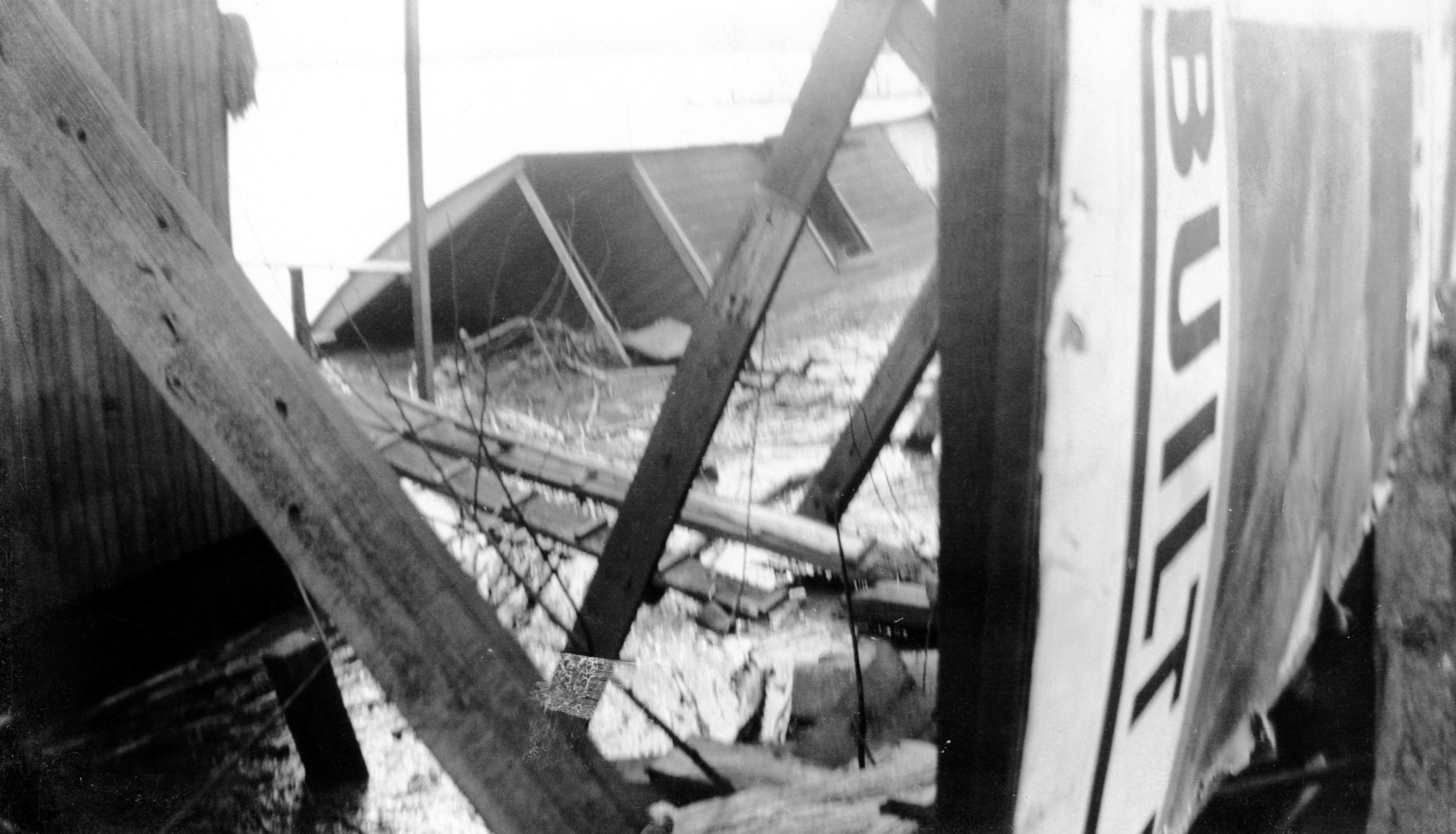 Damage caused by high water on the Ohio River. According to the front page of the Sunday Courier and Journal for this date, the Ohio River was at 44.9 ft. that morning and had begun falling. Flood stage is 42 feet. Although this pictures is difficult to interpret, this appears to be a houseboat that has capsized.