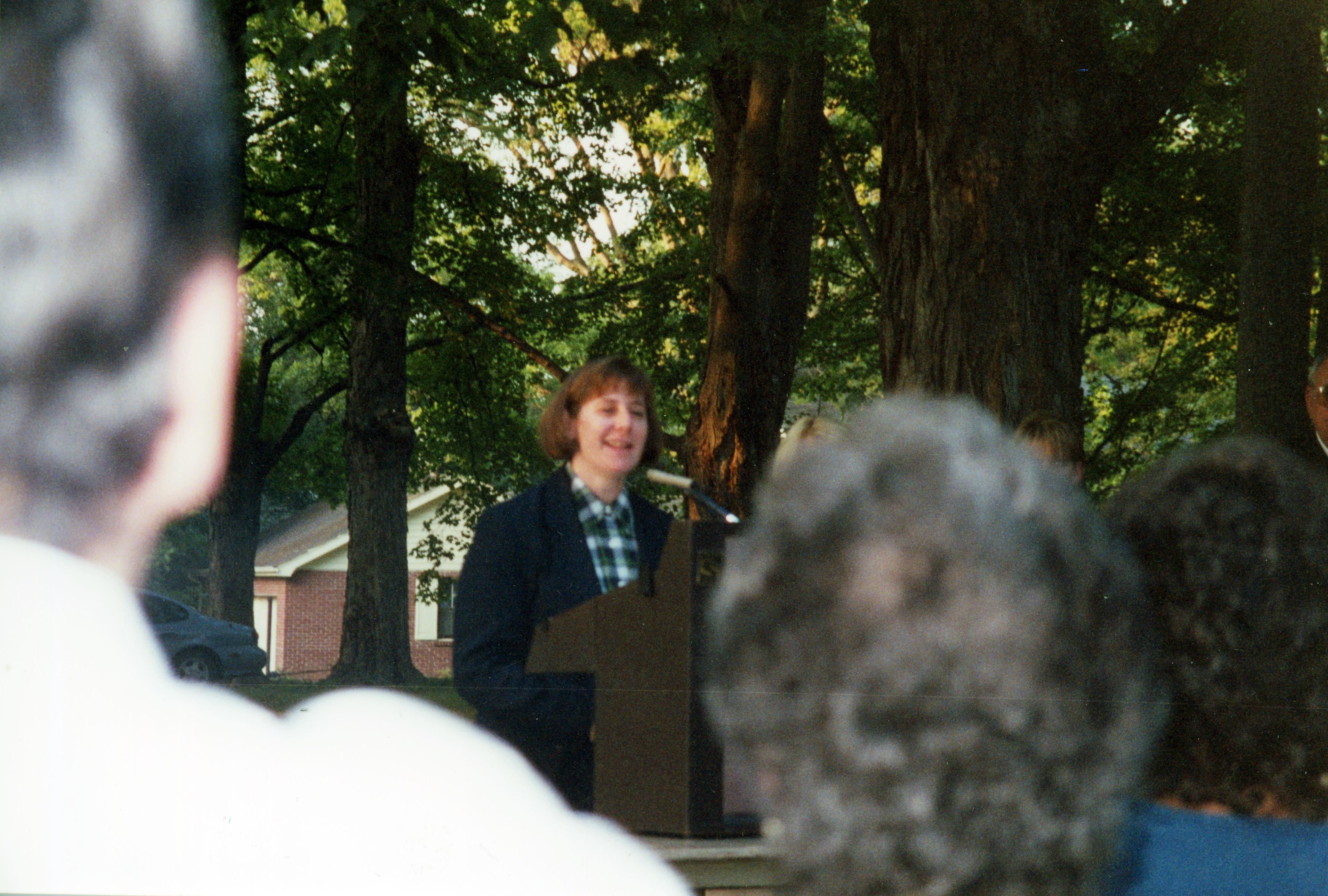 Lori Kaplan speaking at meeting in Murphy Park in New Harmony, IN. "Murphy Park [1014 Main St.] is a large public park featuring both old and new style playgrounds, a basketball court, fitness stations and abundant spaces for picnics or other outdoor activities, including a shelter house that can be rented for special occasions." (https://visitposeycounty.com/state-parks-communities/new-harmony/murphy-park/)