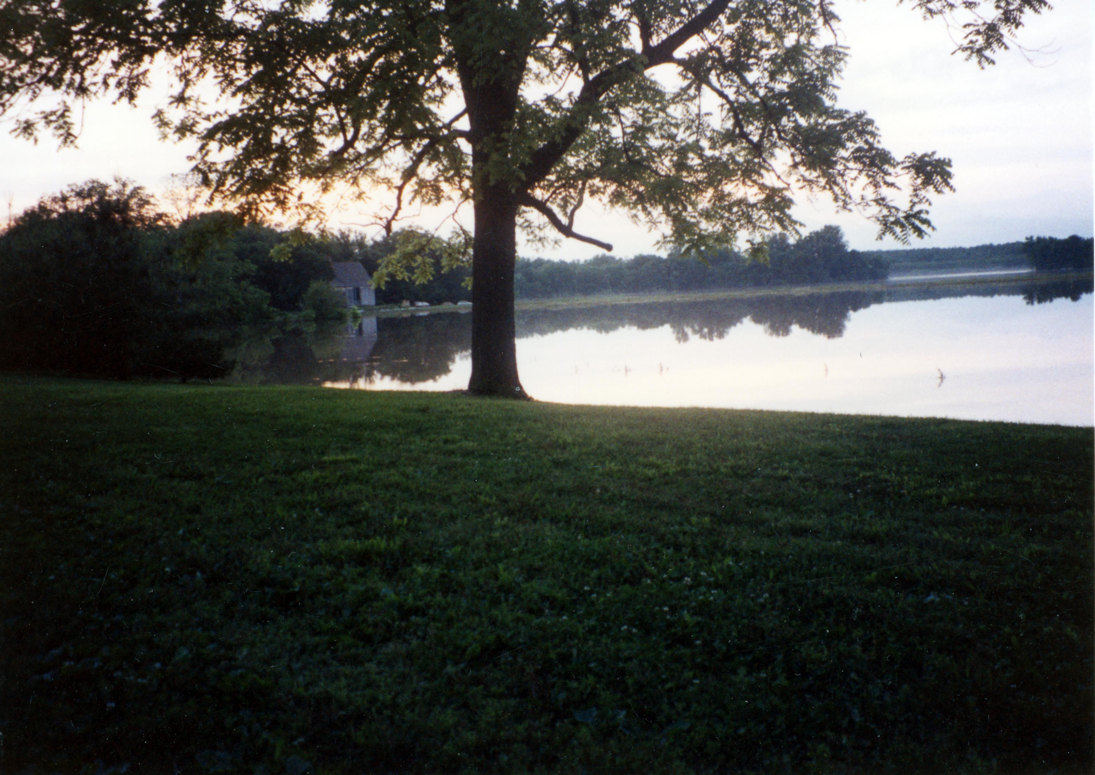 MacLeod Barn Abbey (810 E. North St.) looking across a field with the Wabash River during high water or flood. "The MacLeod Barn Abbey is a beautiful building that provides a communal living space and a great view of the Wabash River and the fields leading up to it. The barn Abbey was originally envisioned as the home of a progressive Christian worship movement based on the ideas of George MacLeod, the leader of a Christian community in Scotland who had ideas for new ways of living as a Christian. Today, it is available for retreats, reunions, receptions and other events." (https://visitposeycounty.com/state-parks-communities/new-harmony/macleod-barn-abbey/)
