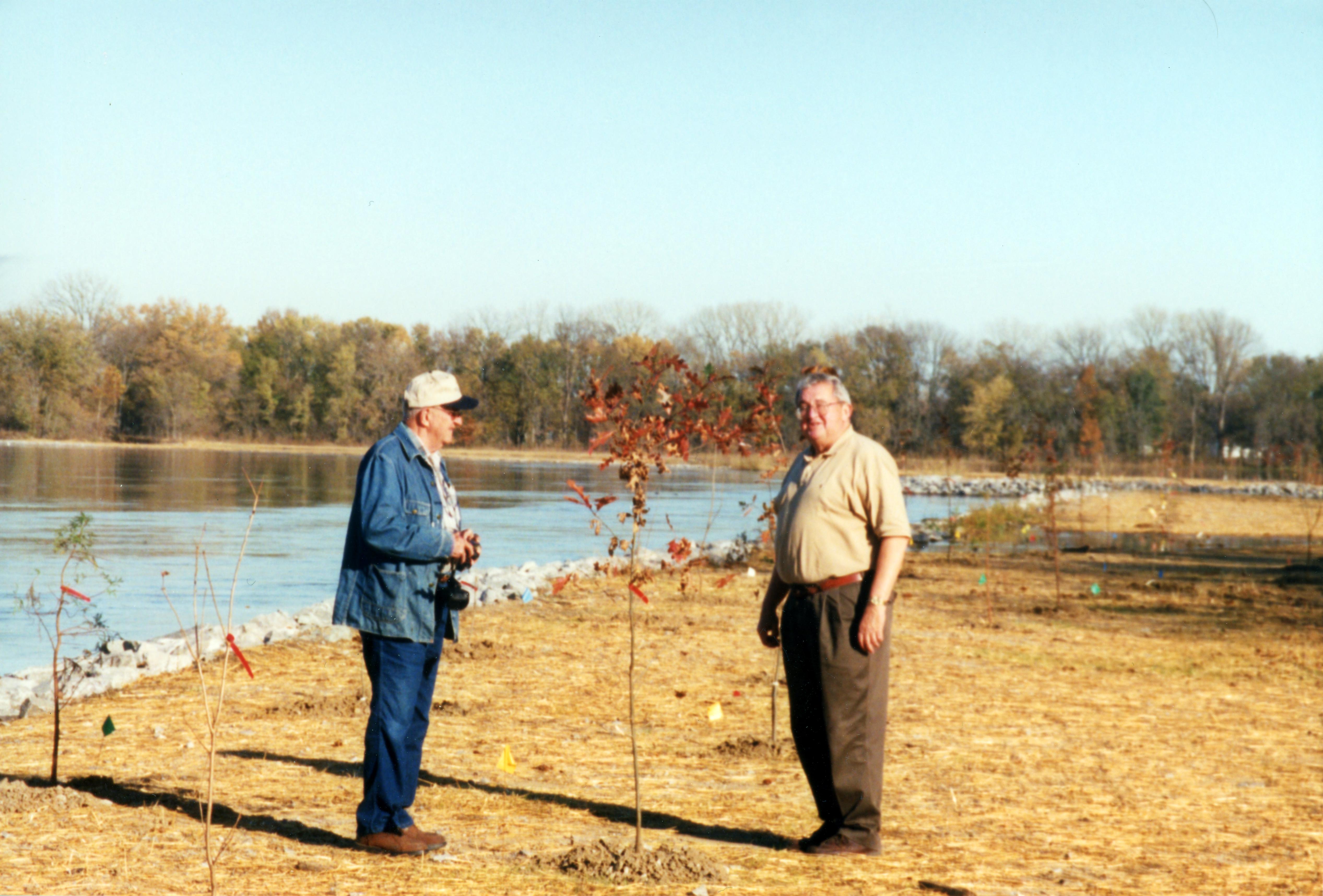 Al Cook and Dr. George Rapp standing in field near flooded Wabash River.