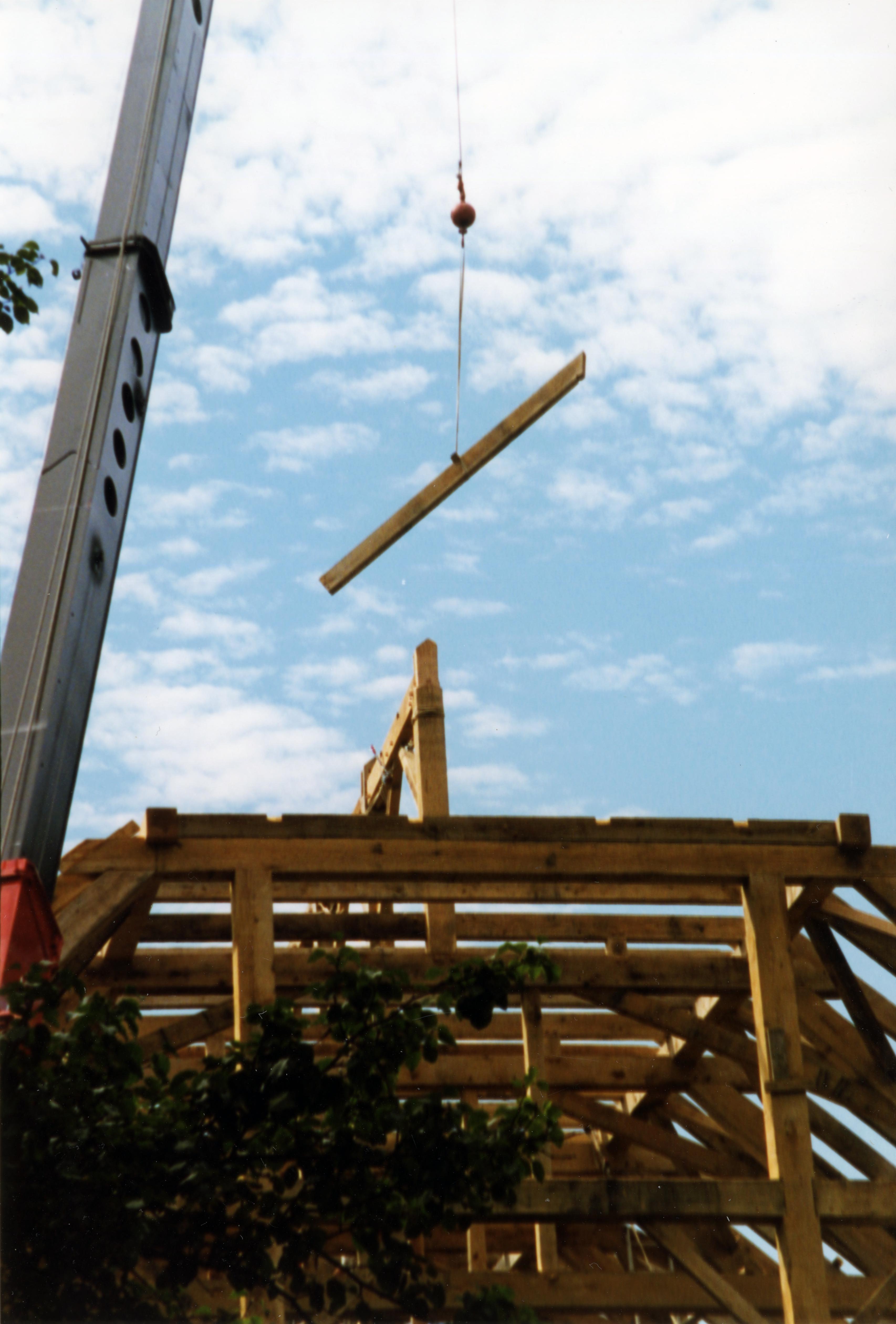 Lifting a portion of the Rapp Owen Granary, 413 Granary St. into position. "The Rapp-Owen Granary is one of New Harmonys most spectacular buildings, and a national landmark as well. Originally seven stories, but later redesigned to be two floors with very high ceilings and solid wood beams and rafters, the building radiates warm spaciousness and awesome grandeur. Built between 1814 and 1818 by the Harmonists to store their grain, it later became a geologic laboratory for William Maclure, known as the father of American Geology, and later for David Dale Owen, Indianas first state geologist. A seismograph is still in operation." (https://visitposeycounty.com/state-parks-communities/new-harmony/the-rapp-owen-granary-venue/) A massive restoration was completed in 1999.