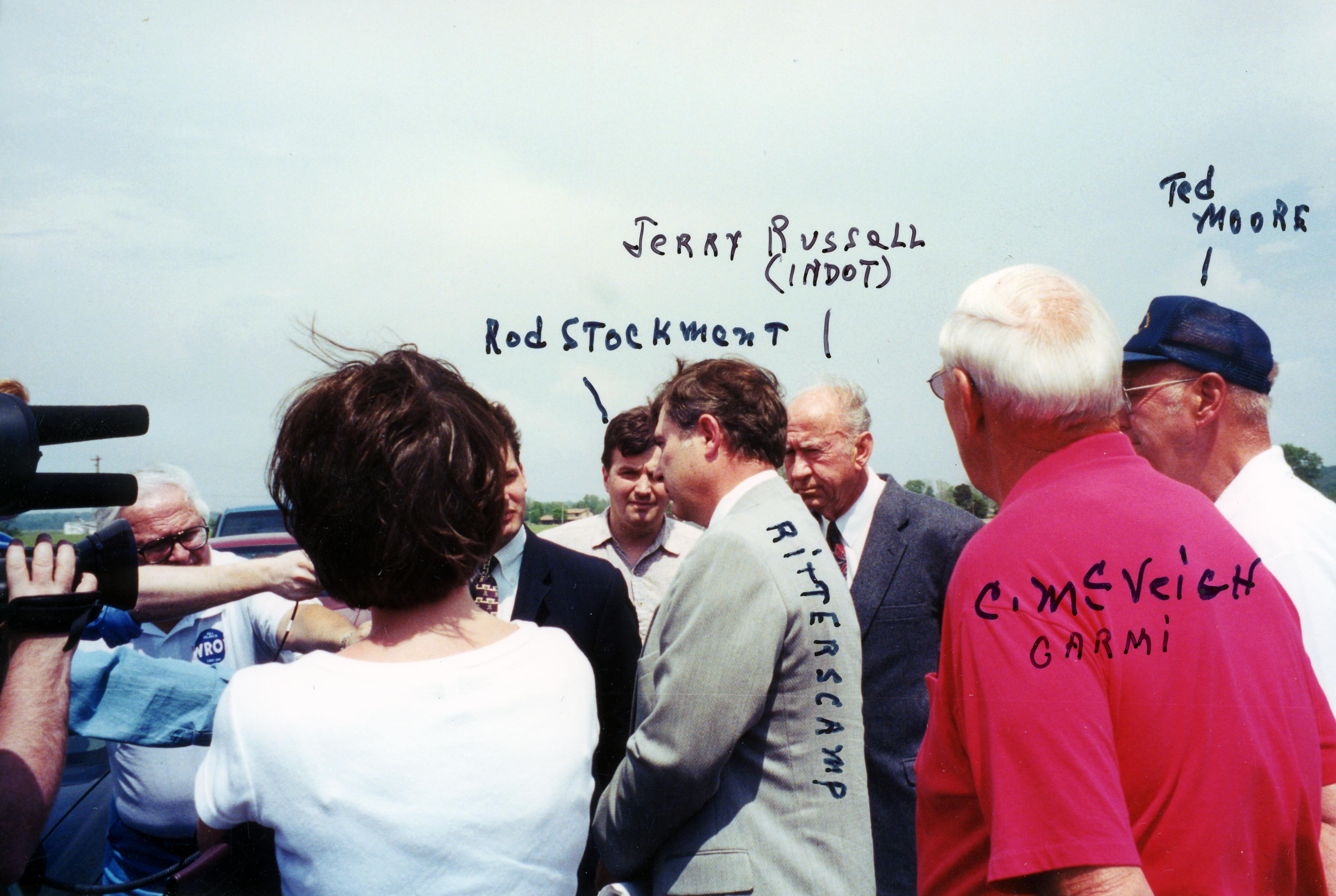 Rod Stockment, Jerry Russell (with INDOT), and Mr. Ritterscamp (engineer) at an INDOT (Indiana Dept. of Transportation) meeting in New Harmony, IN The man with the black tie may be a reporter from WFIE.