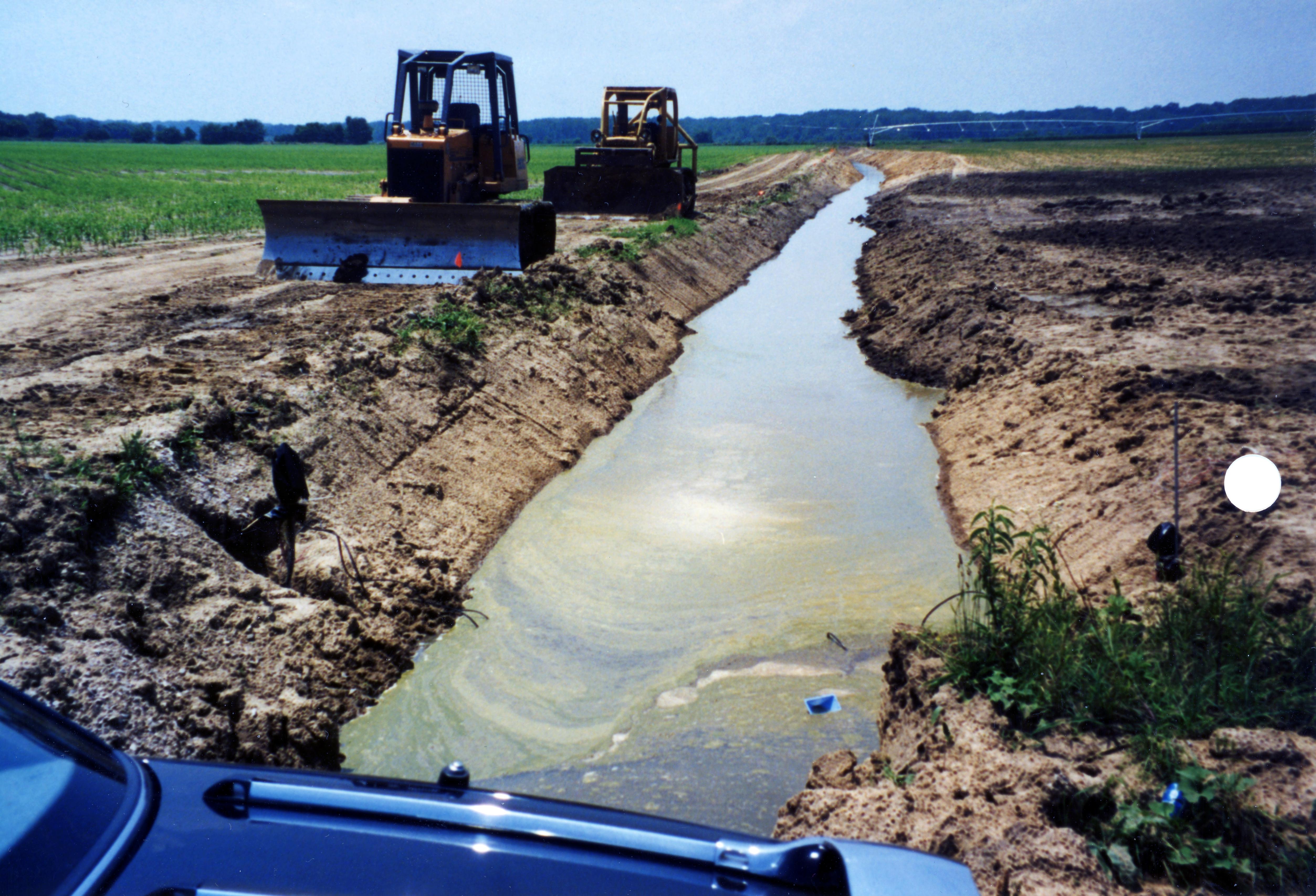 Construction of flooded ditch off of Griffin Road. Back of photo reads: Has river been dammed at west end of ditch?? Same location on Griffin Road as January 28, 1999. Photo with River stage of 18.53 feet. June 24, 1998 Griffin Road at MB 373 feet looking west. River stage 19.3 feet, 372.5 feet elevation"