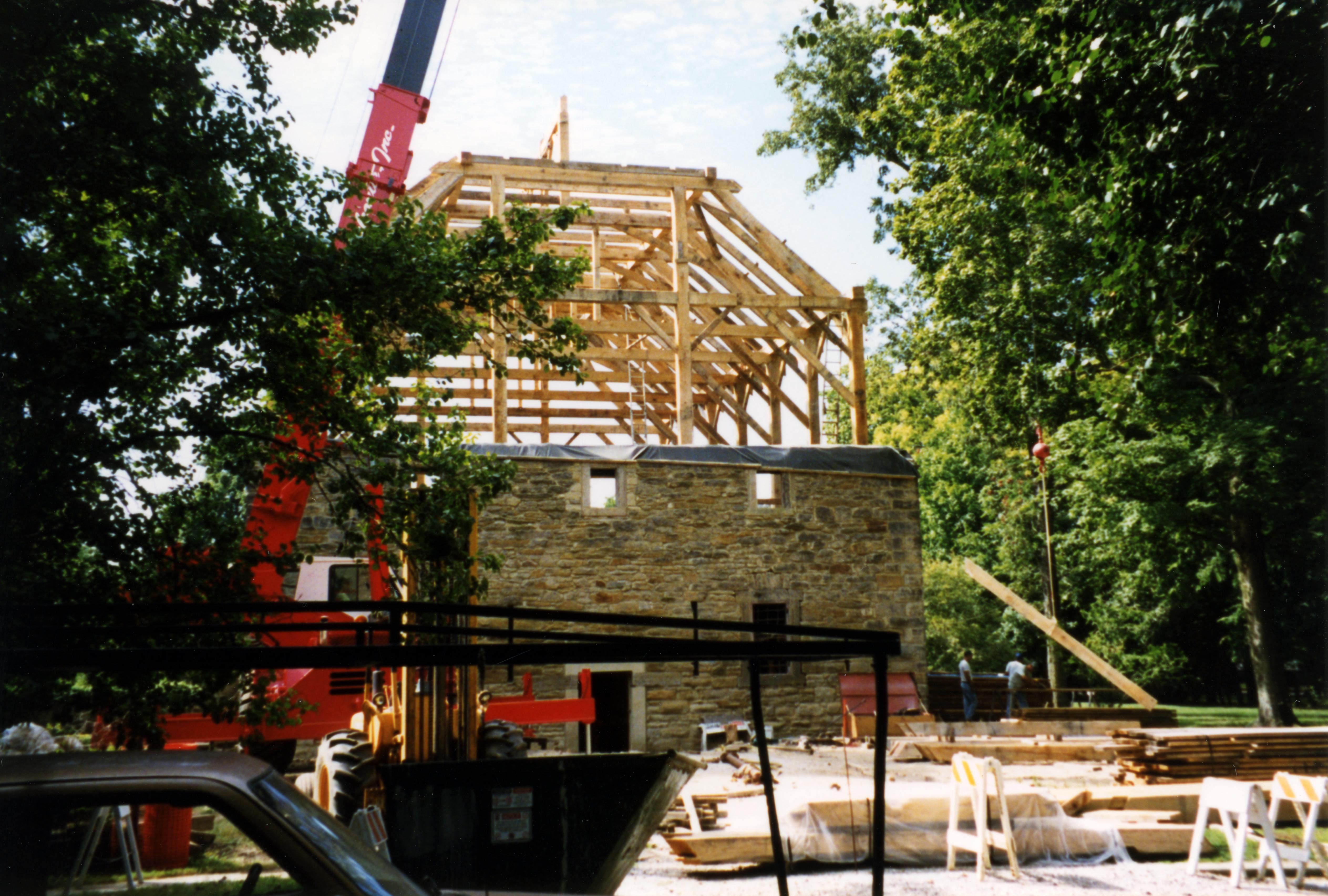 Construction of the Rapp Owen Granary, 413 Granary St. into position. "The Rapp-Owen Granary is one of New Harmonys most spectacular buildings, and a national landmark as well. Originally seven stories, but later redesigned to be two floors with very high ceilings and solid wood beams and rafters, the building radiates warm spaciousness and awesome grandeur. Built between 1814 and 1818 by the Harmonists to store their grain, it later became a geologic laboratory for William Maclure, known as the father of American Geology, and later for David Dale Owen, Indianas first state geologist. A seismograph is still in operation." (https://visitposeycounty.com/state-parks-communities/new-harmony/the-rapp-owen-granary-venue/) A massive restoration was completed in 1999.