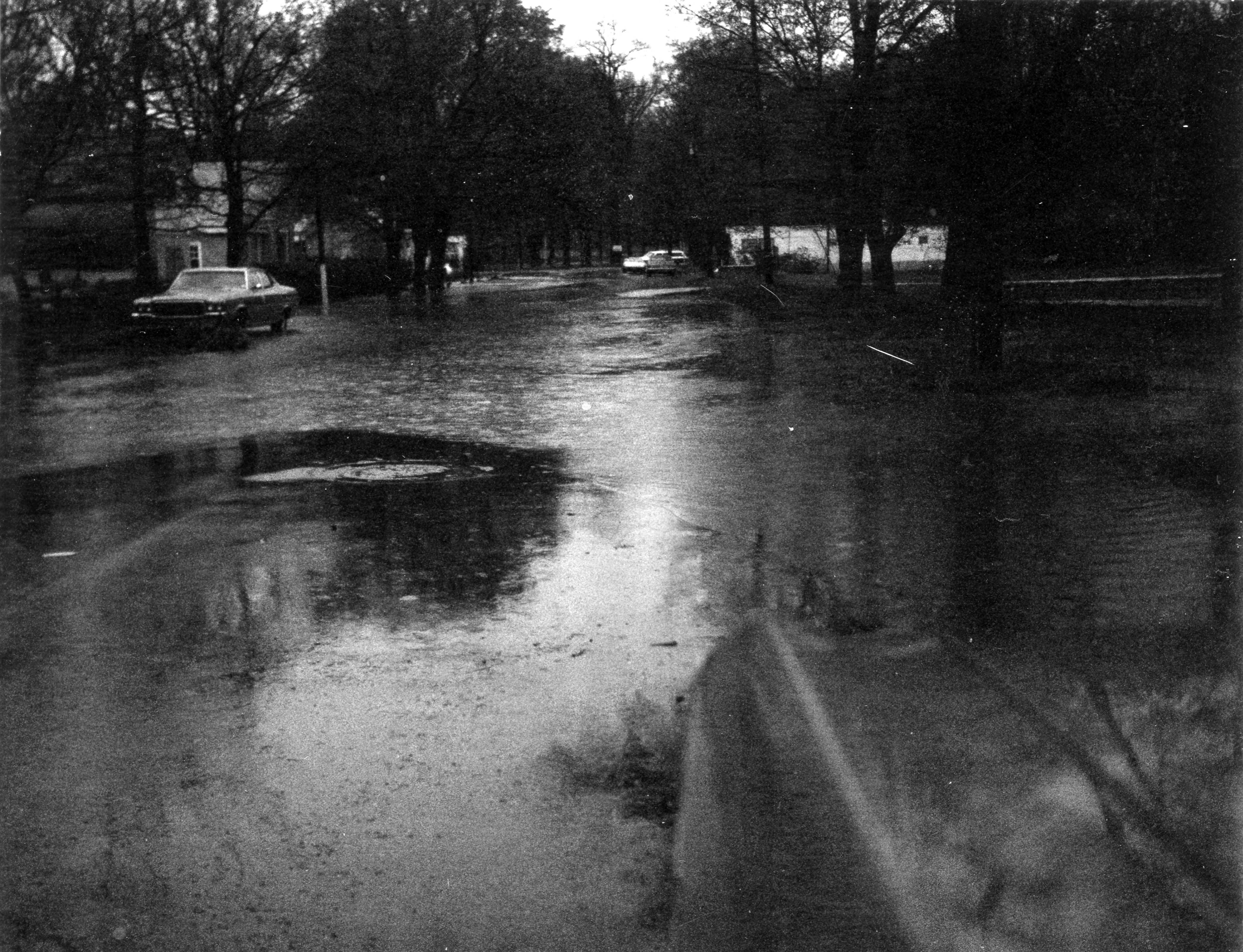 "Brewery St. looking south from Fredrick St. 4.47" rainfall. Water from Ricken Heirs Land" written on back of photo. Flooded roadway