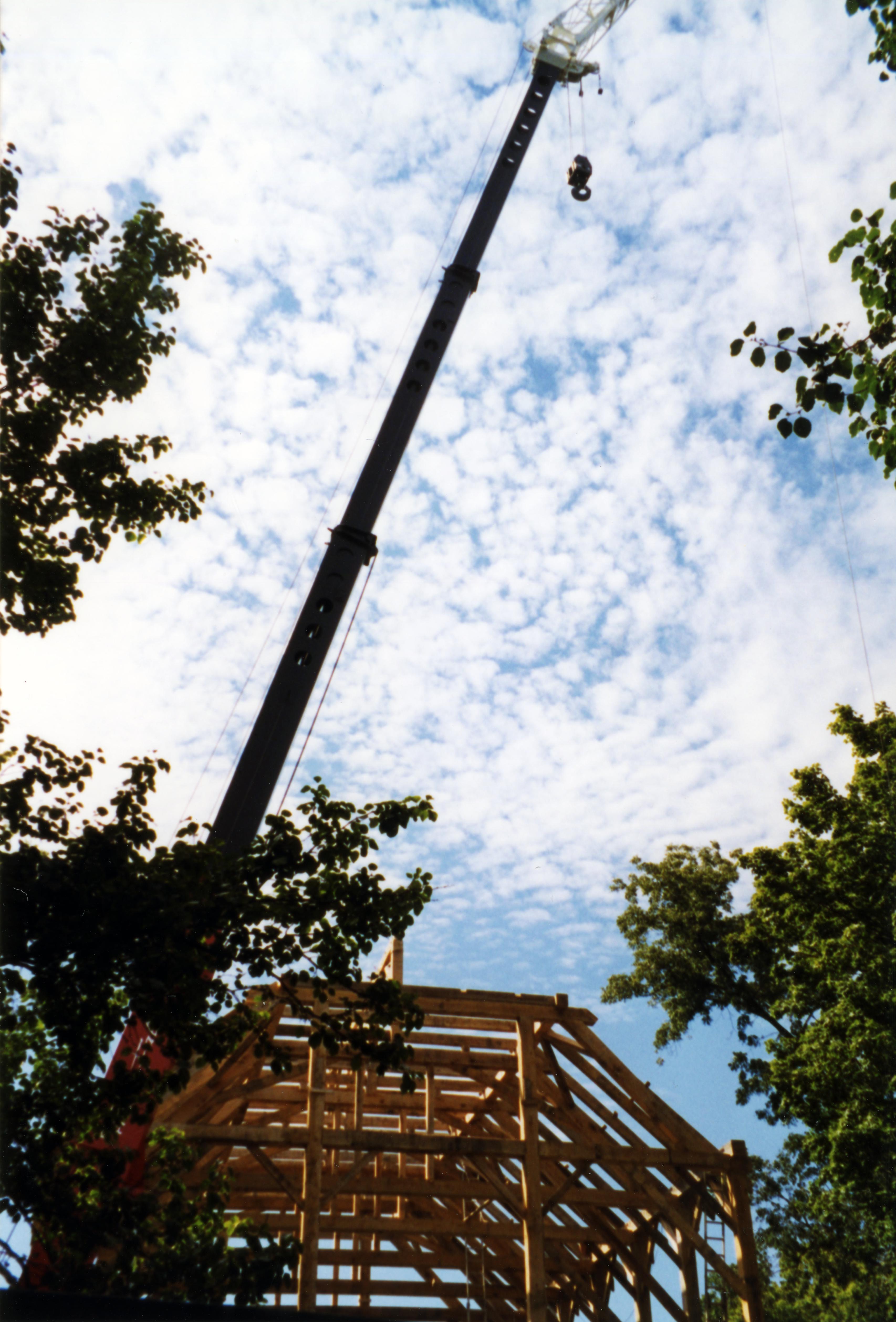 Lifting a portion of the Rapp Owen Granary, 413 Granary St. into position. "The Rapp-Owen Granary is one of New Harmonys most spectacular buildings, and a national landmark as well. Originally seven stories, but later redesigned to be two floors with very high ceilings and solid wood beams and rafters, the building radiates warm spaciousness and awesome grandeur. Built between 1814 and 1818 by the Harmonists to store their grain, it later became a geologic laboratory for William Maclure, known as the father of American Geology, and later for David Dale Owen, Indianas first state geologist. A seismograph is still in operation." (https://visitposeycounty.com/state-parks-communities/new-harmony/the-rapp-owen-granary-venue/) A massive restoration was completed in 1999.