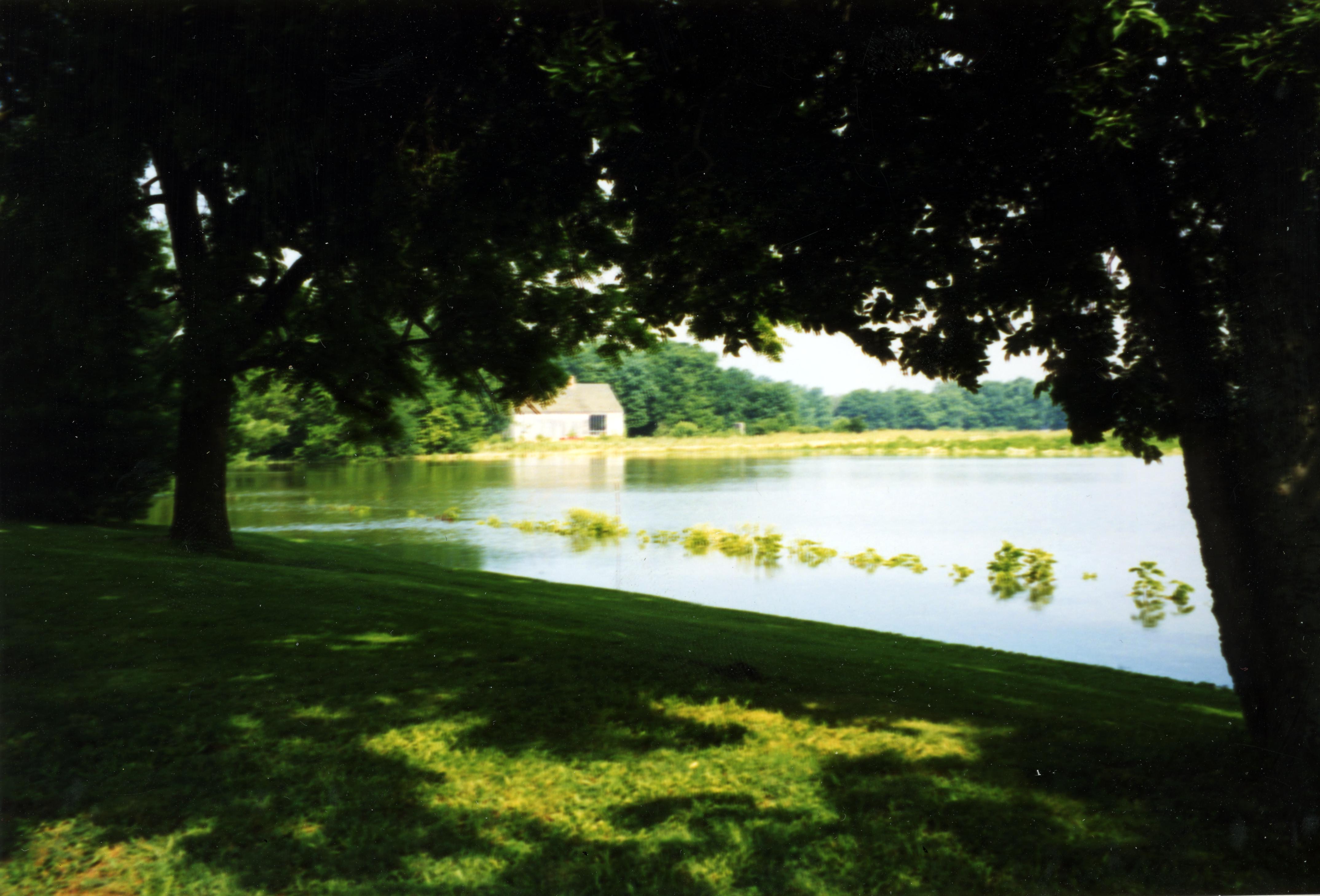 MacLeod Barn Abbey (810 E. North St.) looking across the Wabash River during high water or flood. "The MacLeod Barn Abbey is a beautiful building that provides a communal living space and a great view of the Wabash River and the fields leading up to it. The barn Abbey was originally envisioned as the home of a progressive Christian worship movement based on the ideas of George MacLeod, the leader of a Christian community in Scotland who had ideas for new ways of living as a Christian. Today, it is available for retreats, reunions, receptions and other events." (https://visitposeycounty.com/state-parks-communities/new-harmony/macleod-barn-abbey/)