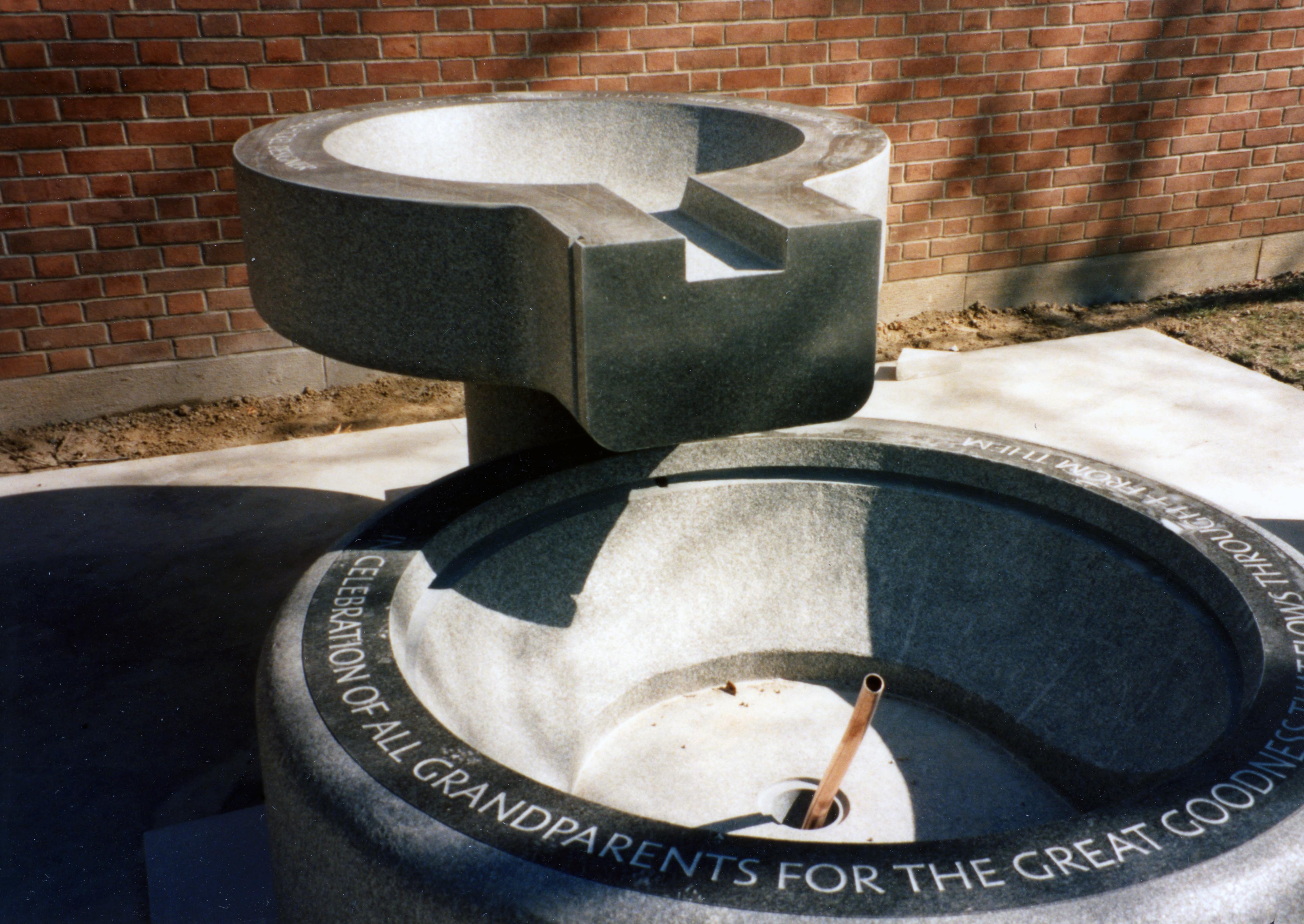 Working on the sculptural fountain at the Roofless Church; "baptismal" written on back of photo. "The Roofless Church [420 North St.] is one of New Harmonys premier architectural and spiritual, treasures. The result of Jane Owens obsession with building a place of welcome for people of all faiths, it was built on the principle that the sky is the only roof large enough to encompass a world of worshippers. The Roofless Church is an open space surrounded by a brick wall. Its most prominent feature is a dome covered in cedar shingles that covers a statue by Jacques Lipschitz. There are other sculptures by prominent artists, including Stephen De Staebler, both inside and outside the wall; as well as a small, quiet garden with benches for contemplation. A balcony with stone benches provides a beautiful frame for the natural world outside. The structure was designed by the renowned architect ?Philip Johnson, whose International Style was responsible of the glass and steel nature of many of the twentieth centurys most prominent skyscrapers. Johnson and Lipchitz also did work on the Rockefeller Guest House in New York City. In addition to being a pleasant place to visit, the Roofless Church has long been a favorite venue for weddings and other events." (https://visitposeycounty.com/state-parks-communities/new-harmony/the-roofless-church/)