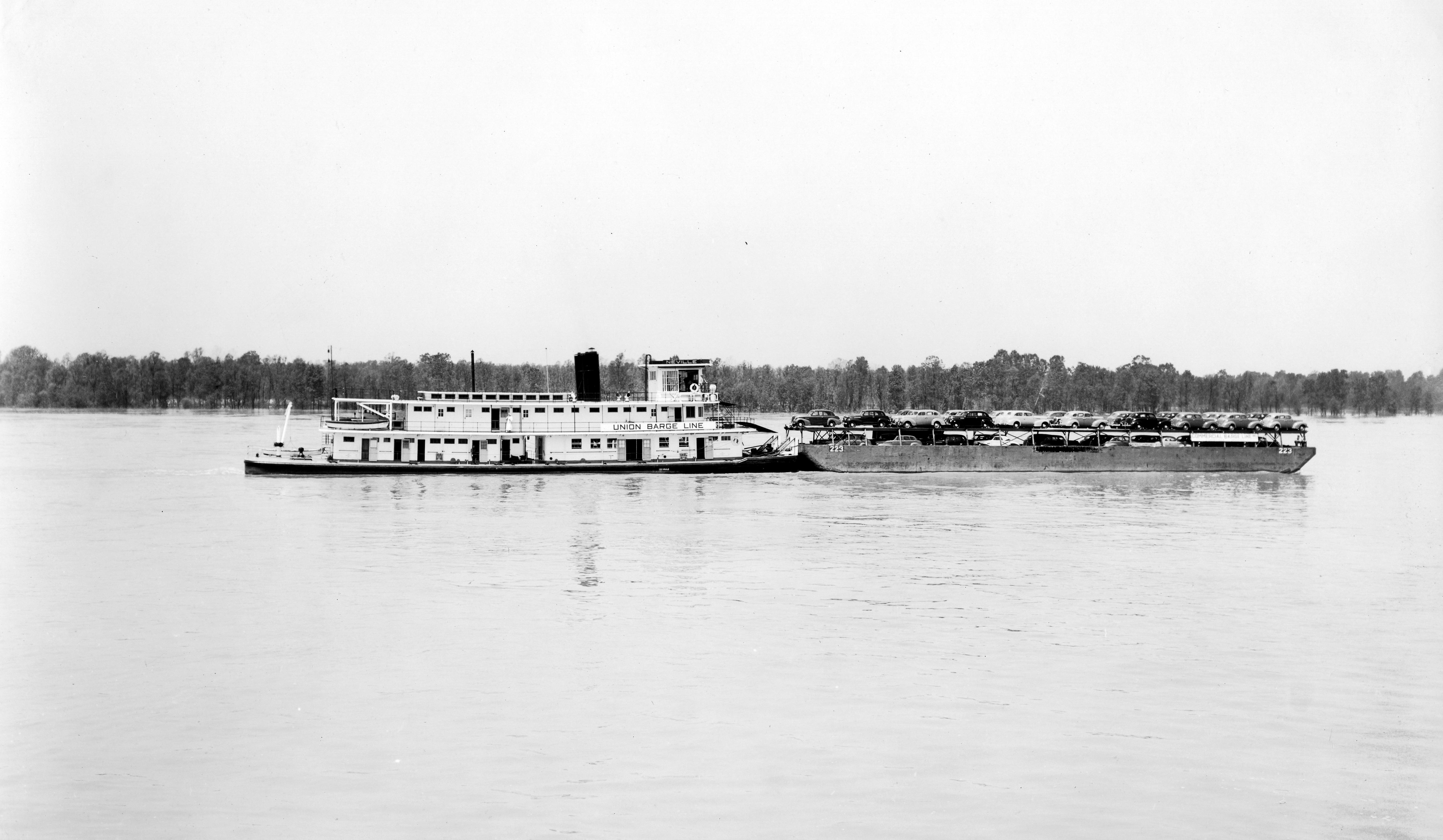 Union Barge Line towboat Neville pushing a barge hauling cars. This towboat was built at Neville Island, PA by Dravo Corporation in 1935 and was diesel powered. It was owned by Union Barge Line Corp. of Pittsburgh, PA.