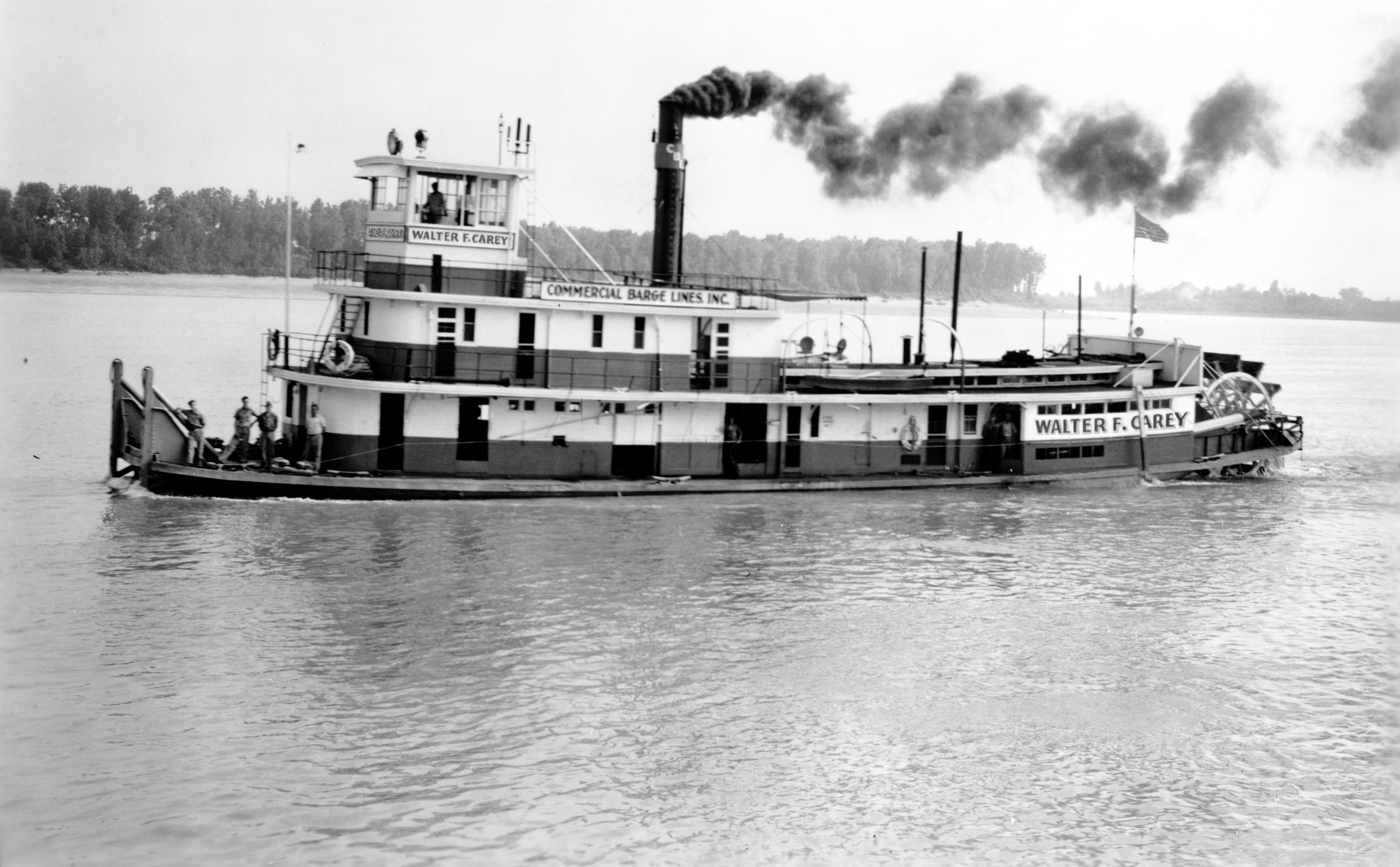The Walter F. Carey, a steel hull, twin propellor towboat built at St. Louis Mo. by the St. Louis Shipbuilding and Steel Co. in 1943. The Carey was built from the sternwheel steam towboat Tallulah; built at Jeffersonville, Ind. in 1922. Owned by Commercial Barge Line, Inc., Detroit. NOTE- in MSS 262-108 this does not have a paddlewheel.