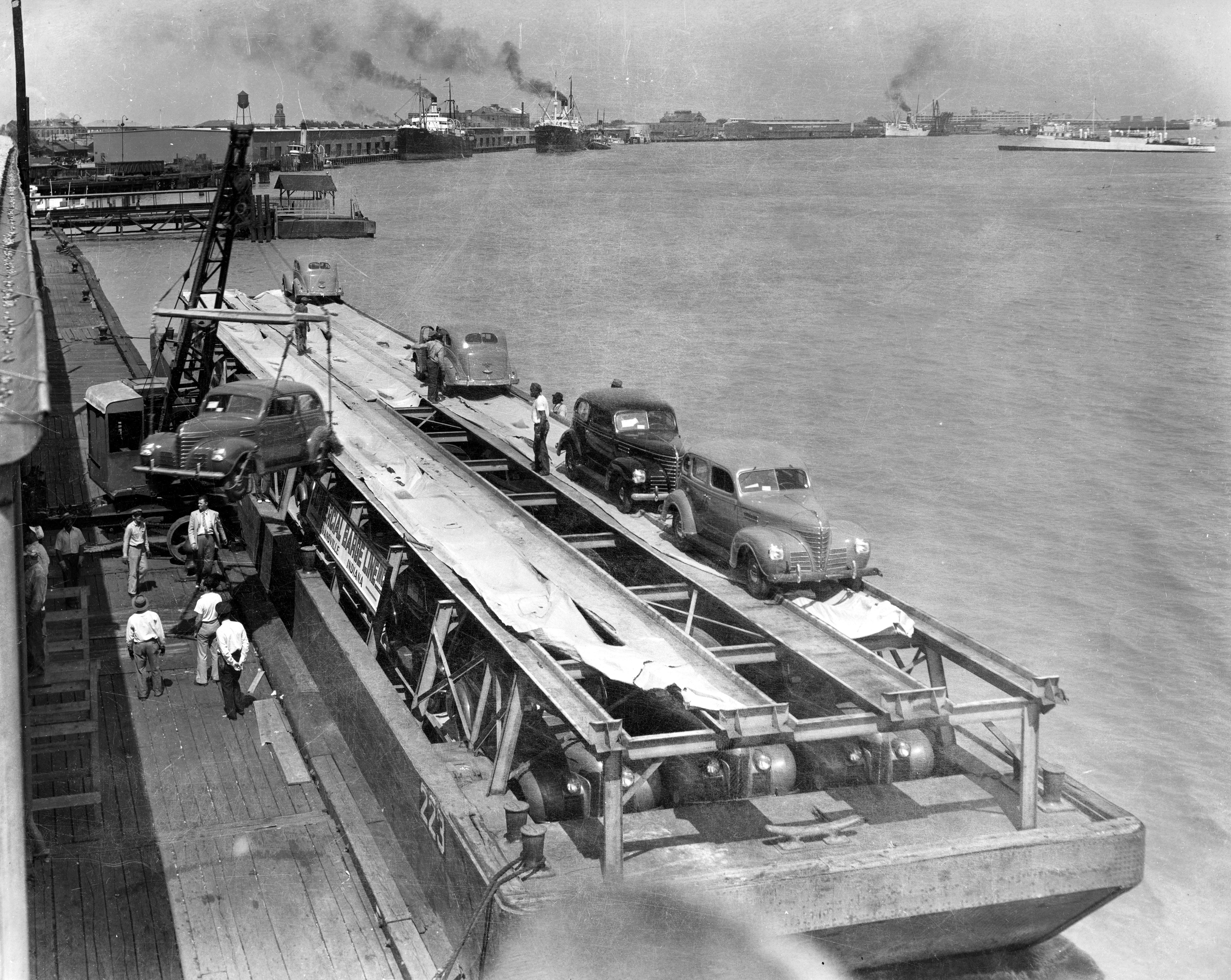 Loading cars onto Commercial Barge Lines (Evansville, Indiana) barge.