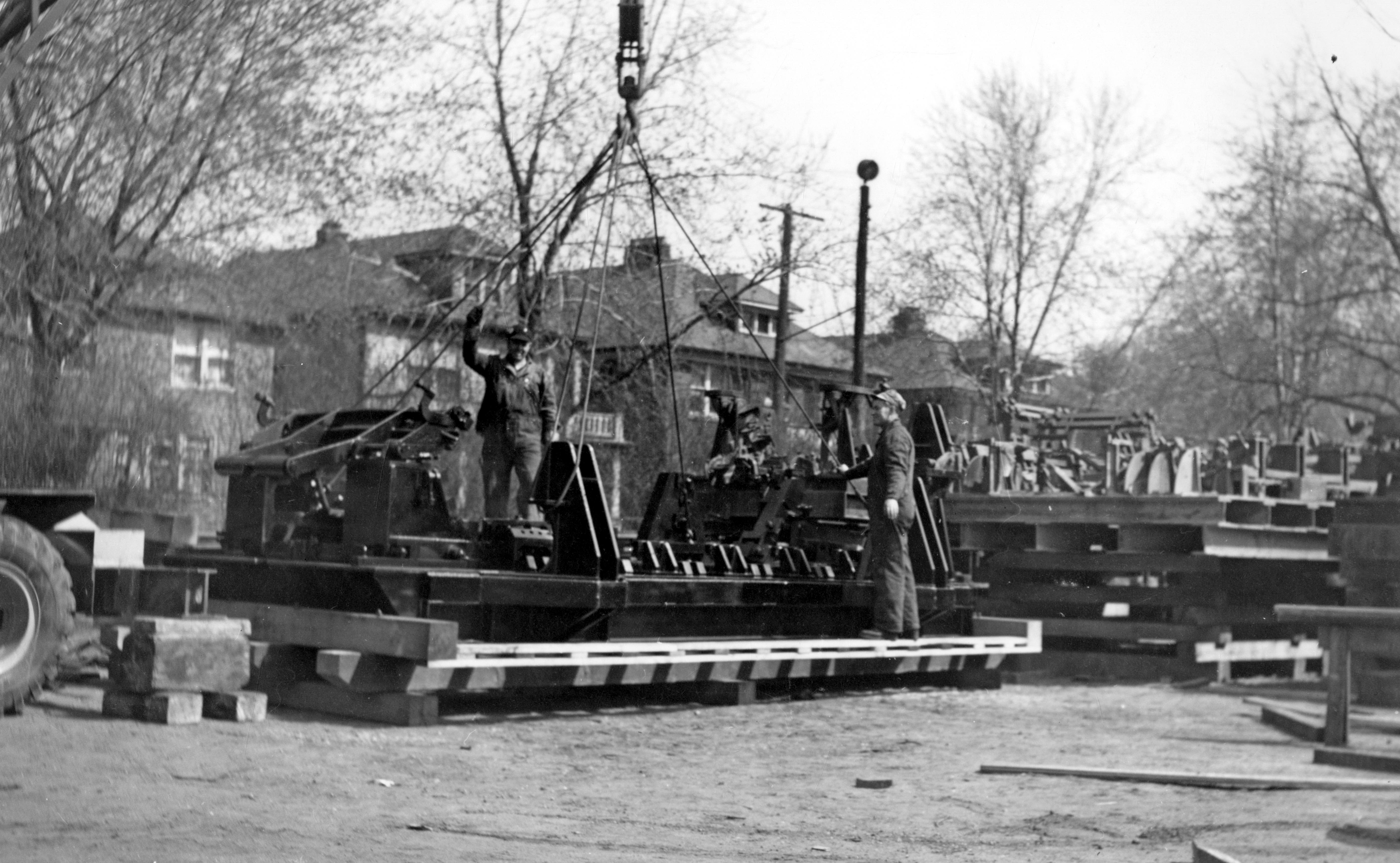 Men standing on some sort of platform, with a crane, not seen, attacked to a large unidentified object, ready to lift it.