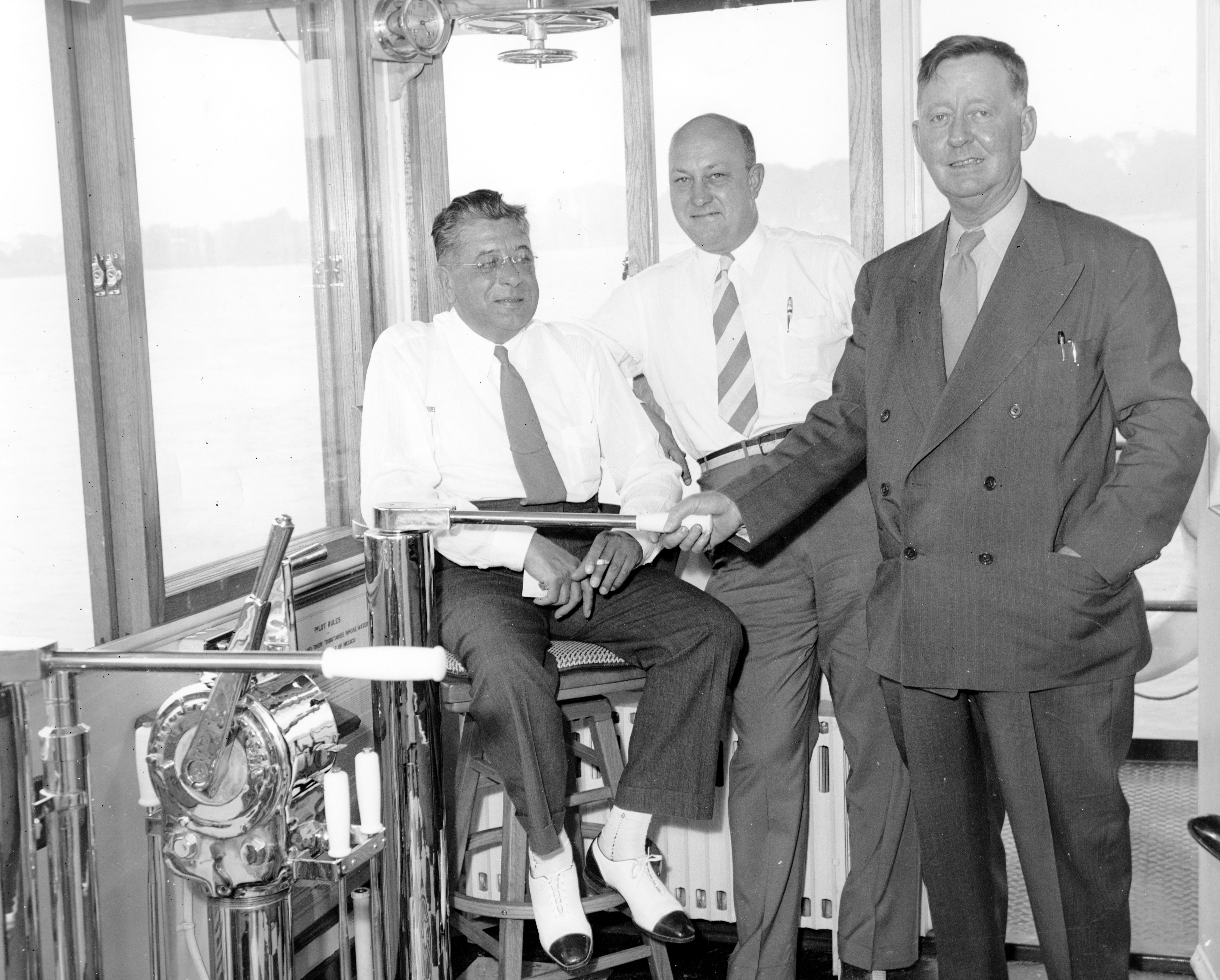 Three well-dressed, unidentified men in pilot house of a boat or ship.