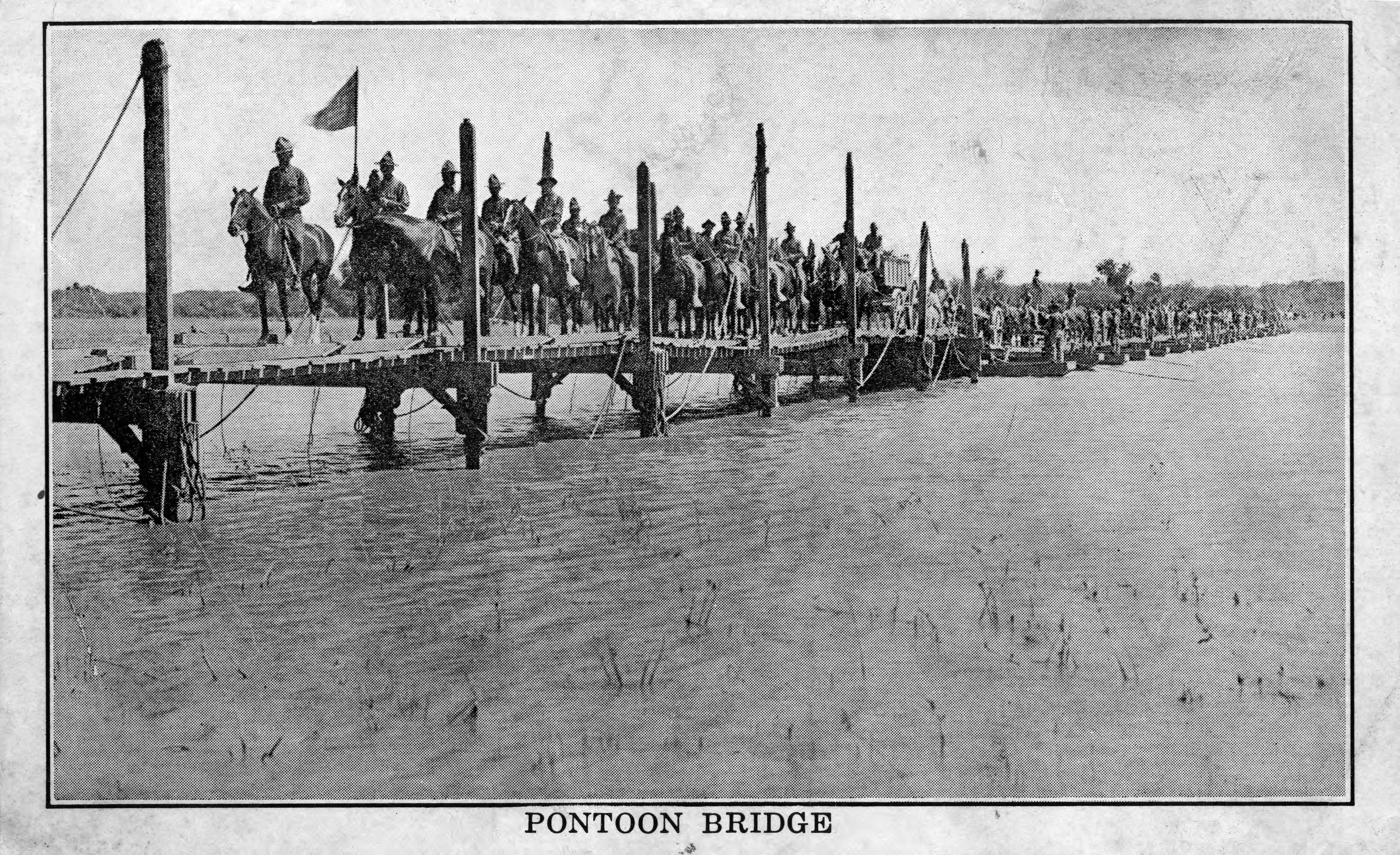 YMCA postcard of soldiers crossing a pontoon bridge. ""YMCA prisoner-of-war work --which was to be undertaken on a massive scale in the following century's two world wars -- began during the Civil War, with the YMCA ministering to the needs of Confederate soldiers imprisoned in the north and Union soldiers in the south. Journals record that the YMCA through the U. S. Christian Commission distributed some 100,000 cases of food, clothing and medical supplies, and a total of 12 million books, magazines and pamphlets. Volunteer ""delegates"" wrote an estimated 90,000 letters for the sick and wounded, and distributed $1000 a week in postage for troop correspondence. During the period of peace after the Civil War, the YMCA continued its services, largely in state militia camps. New programs and services were introduced, including the military's first recreational and sports programs and counseling services for military personnel. The tradition of serving the troops beyond the nation's borders began during the Spanish-American War, when YMCA staff and volunteers were dispatched to Cuba, Puerto Rico and the Philippines. YMCA supplies, including medicine and office materials, reached Cuba before the army's own supplies; and early dispatches from Teddy Roosevelt's Rough Riders were written on YMCA stationery. Similar army use of YMCA stationery occurred during military operations in Europe a few years later. General John J. Pershing, appreciative of the support that the YMCA had provided the Army during action along the U. S.- Mexican border, at the beginning of the Great War would task the YMCA with enormous responsibilities. In the years before that war, the YMCA had developed mobile canteens and recreational facilities and had broad expertise in service to the armed forces. It was an expertise that would soon blossom into a massive program of morale and welfare services for the military on the home front and particularly overseas. When war was declared in 1917, the YMCA immediately volunteered its support, and President Woodrow Wilson quickly accepted it. The YMCA assumed military responsibilities on a scale that had never been attempted by a nonprofit, community-based organization in the history of our nation and would never be matched again. It was at the conclusion of that war that the military services began to institutionalize the massive human services work carried out by the YMCA."" (http://www.worldwar1.com/dbc/ymca.htm) SEE MSS 259-042 for an explanation of the YMCA's post-war work.