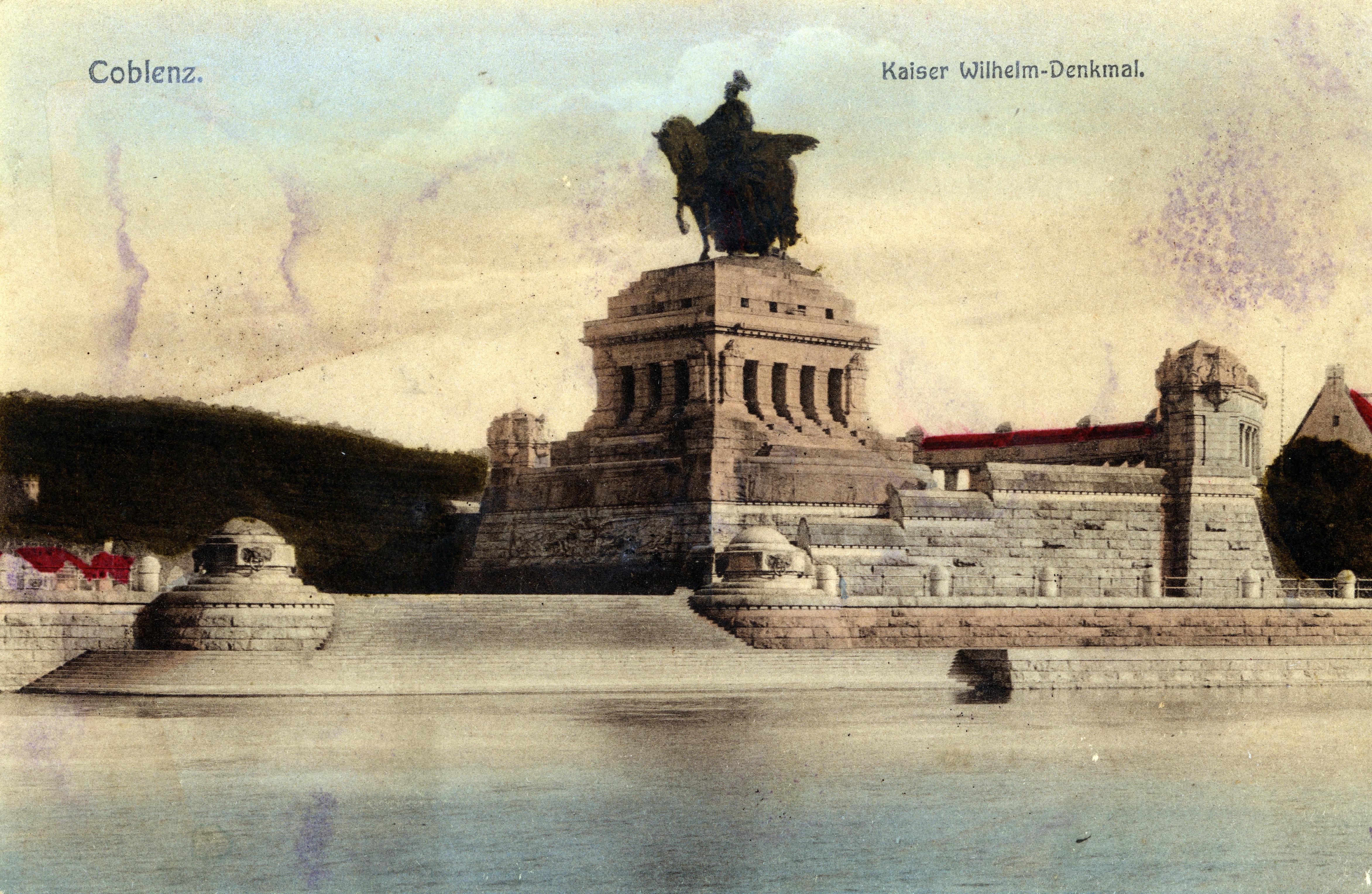 Postcard of ""Coblenz. Kaiser Wilhelm-Denkmal.""--a monument to Emperor William I. ""After the death of Emperor William I in 1888, his grandson William II wished to spark a nationalist cult around the ""founder of the German Reich."" In the following years the privately funded Kyffh�user Monument was erected and an Emperor William Monument was inaugurated in Porta Westfalica, both designed by the Leipzig architect Bruno Schmitz. Several other cities had also applied as installation sites and in 1891 William II decided upon the confluence of the Rhine and Mosel rivers at Koblenz. After further landfills at the site and a large-scale collection campaign, the official ""Emperor William Monument of the Rhine Province"" was erected and solemnly inaugurated in the presence of the emperor on 31 August 1897. Bruno Schmitz again had drawn up the plans for a giant, over 37 metres (121 ft) high monument installed at the tip of the Deutsches Eck [German Corner], bearing an inscription quoting a verse by the Koblenz poet Max von Schenkendorf: Nimmer wird das Reich zerst�ret, wenn ihr einig seid und treu (""Never will the Empire be destroyed, so long as you are united and loyal""). Another inscription could be found at the statue dedicating it to Wilhelm der Gro�e (""William the Great""). The equestrian statue itself, 14 m (46 ft) in height, presented William I in a general's uniform, reminiscent of the Prussian victories in the ""German Wars of Unification"". His horse is roped by a winged female genius bearing a laurel wreath and the Imperial Crown. ... While the inner city of Koblenz was hit hard by Allied strategic bombing during World War II, the Deutsches Eck remained largely unscathed. On 16 March 1945, however, the statue was badly damaged by an American artillery shell. The Third US Army 87th Artillery unit led by Sergeant Loyd Watson fired upon it after the forward observer saw a German soldier depart from it. They assumed it was a base of operations and it was hit after 3 tries. Soon afterwards it was completely taken down. The French military government planned to replace the old memorial with a monument for peace and understanding among nations, but this concept was never realized. After the formation of the Federal Republic of Germany and the German Democratic Republic in 1949, the country was divided into a capitalist west and a communist east. In order to express the deep wish for a united Germany, President Theodor Heuss turned the German Corner into a monument to German unity. As a result, the coats of arms of all German L�nder (states), including those of former German territories such as Silesia, East Prussia and Pomerania, were installed. Replacing the destroyed equestrian statue, a German flag flew over the plaza. After the Berlin Wall came down in November 1989, three concrete parts of the actual wall were installed next to the monument. On 3 October 1990, the emblems of the new federal states were added. With German Reunification in 1990, the German Corner no longer served as a symbol of the aspiration for a united Germany. Thus, a discussion arose regarding a remodelling of the plaza. Critics considered the reinstallation of the equestrian statue of Wilhelm I as out of time and improper, whereas promoters saw the opportunity for tourist benefits. As the owner of the site, any decision to reinstall a statue of Wilhelm I rested with the government of the Rhineland-Palatinate. However, the state government transferred its rights to the city of Koblenz and when Werner and Anneliese Theisen (a couple from Koblenz) announced that they would bear all costs for a reconstruction of the statue, the decision was made to proceed. The D�sseldorf sculptor, Raymond Kittl, was commissioned to produce a replica of the original sculpture and the remodelled statue was created from durable bronze cast unlike the original which had been made from copper plates. In May 1992, the parts of the statue were brought to Koblenz on board the MS Futura. The assembly work was completed at the port and on 2 September 1993 a mobile lattice boom crane lifted the statue onto the base. The installation took place on Sedan Day, which although no longer officially recognized, was the day on which the German victory in the Battle of Sedan was commemorated. On 25 September 1993, the new statue was inaugurated. Today, a big national flag and the flags of the 16 L�nder are flying at the German Corner as a reminder of German unity. The three parts of the Berlin Wall are now dedicated to the ""victims of the division."" (https://en.wikipedia.org/wiki/Deutsches_Eck)