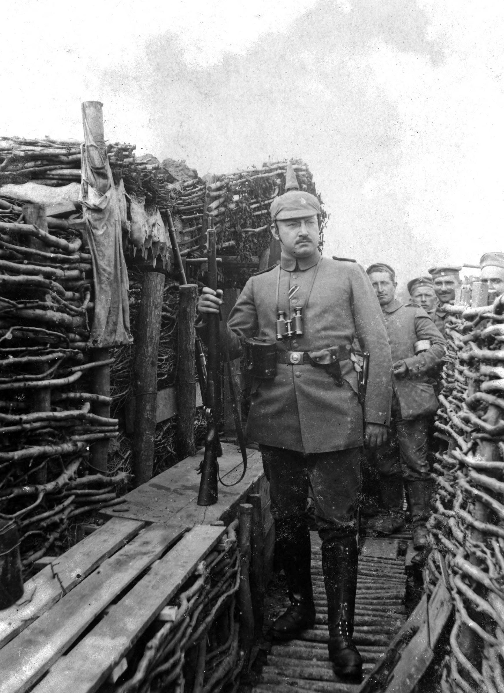 A German officer and soldiers in a trench--the back of the photograph specifically reads, ""A German officer in a trench before Verdun."" Trench warfare was prevalent on the western front, and ""by the end of 1914, both sides had built a series of trenches that went from the North Sea and through Belgium and France."" If the trenches were laid end to end, they would cover an estimated 25,000 miles. ""The typical trench was dug around twelve feet deep into the ground. There was often an embankment at the top of the trench and a barbed wire fence. Some trenches were reinforced with wood beams or sandbags. The bottom of the trench was usually covered with wooden boards called duckboards. The duckboards were meant to keep the soldiers' feet above the water that would collect at the bottom of the trench."" (http://www.ducksters.com/history/world_war_i/trench_warfare.php) It was said that German trenches were generally better built than those of the Americans. The battle of Verdun (February 21-December 18, 1916) was the longest and costliest battle of WWI. ""Verdun was one of the most savagely fought battles of World War One. The Germans fired two million shells in the opening eight-hour bombardment, and tens of millions were fired over the course of the conflict. It was also the longest battle, lasting 300 days and leaving an estimated 800,000 soldiers dead, wounded or missing. At the end of the bloodshed, France emerged as the victor, yet neither side had much to show in the way of military gains. A deadly combination of strategy and circumstances ensured Germany and France fought on for nearly 10 months, even when the largest swathe of territory gained amounted to a mere five miles. Pride, politics and tactics would all play a role in prolonging one of the deadliest conflicts of the Great War."" (http://www.bbc.co.uk/guides/zydwtyc)