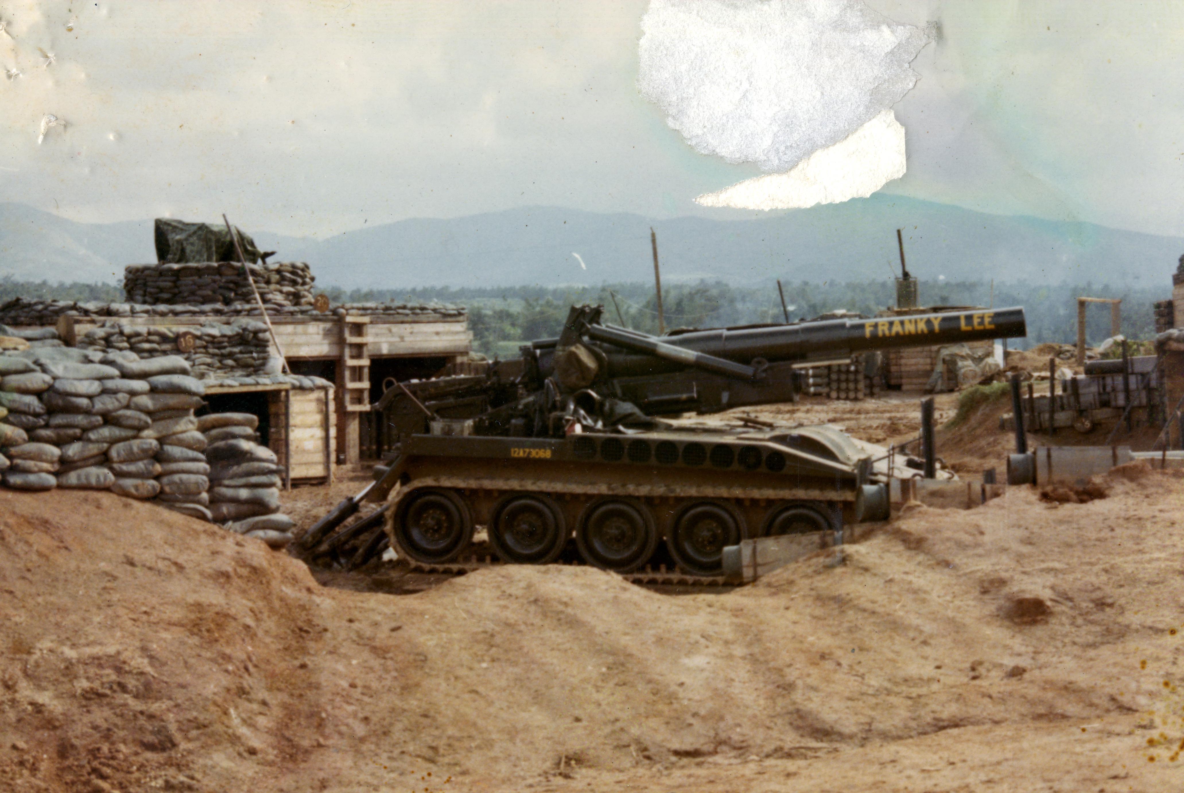 Tank near a fortification with the words ""Franky Lee"" painted in yellow on the barrel.