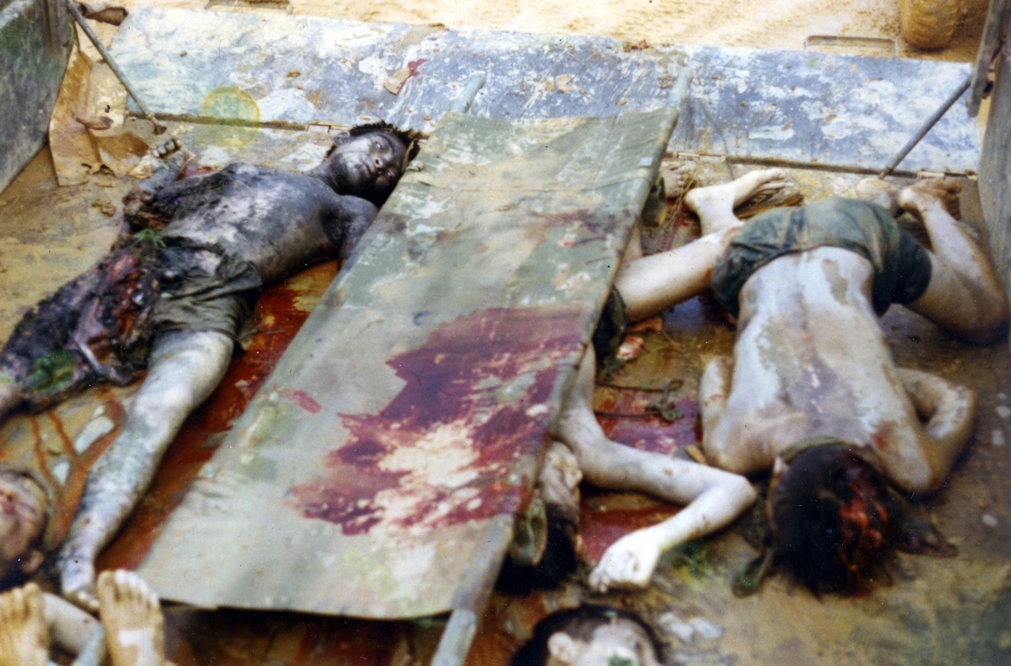 Deceased Vietnam War victims--young boys or men, lying in mud, near a stretcher. The originator of this collection, Rick Winters, served in the Vietnam War as a forward air controller with TACP 1st Battalion, 7th Marines.