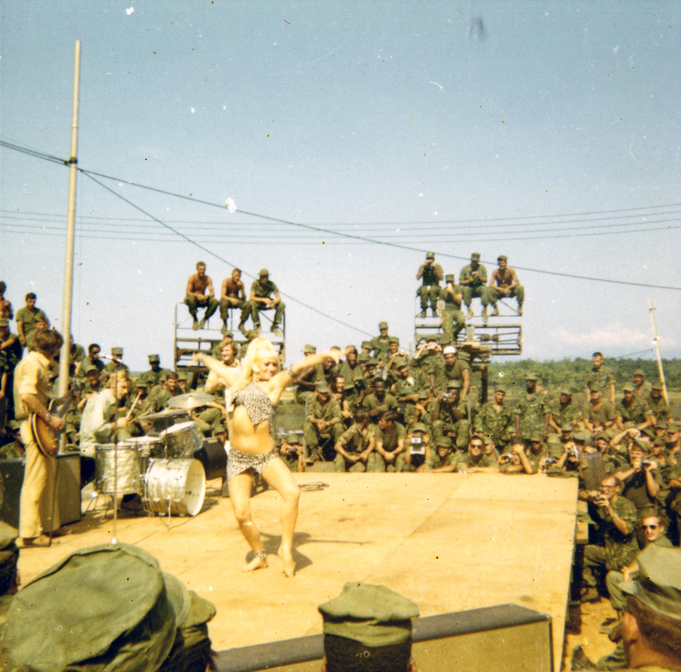 Soldiers sitting around a stage watching a band perform and a woman dance--possibly a USO show in Vietnam.