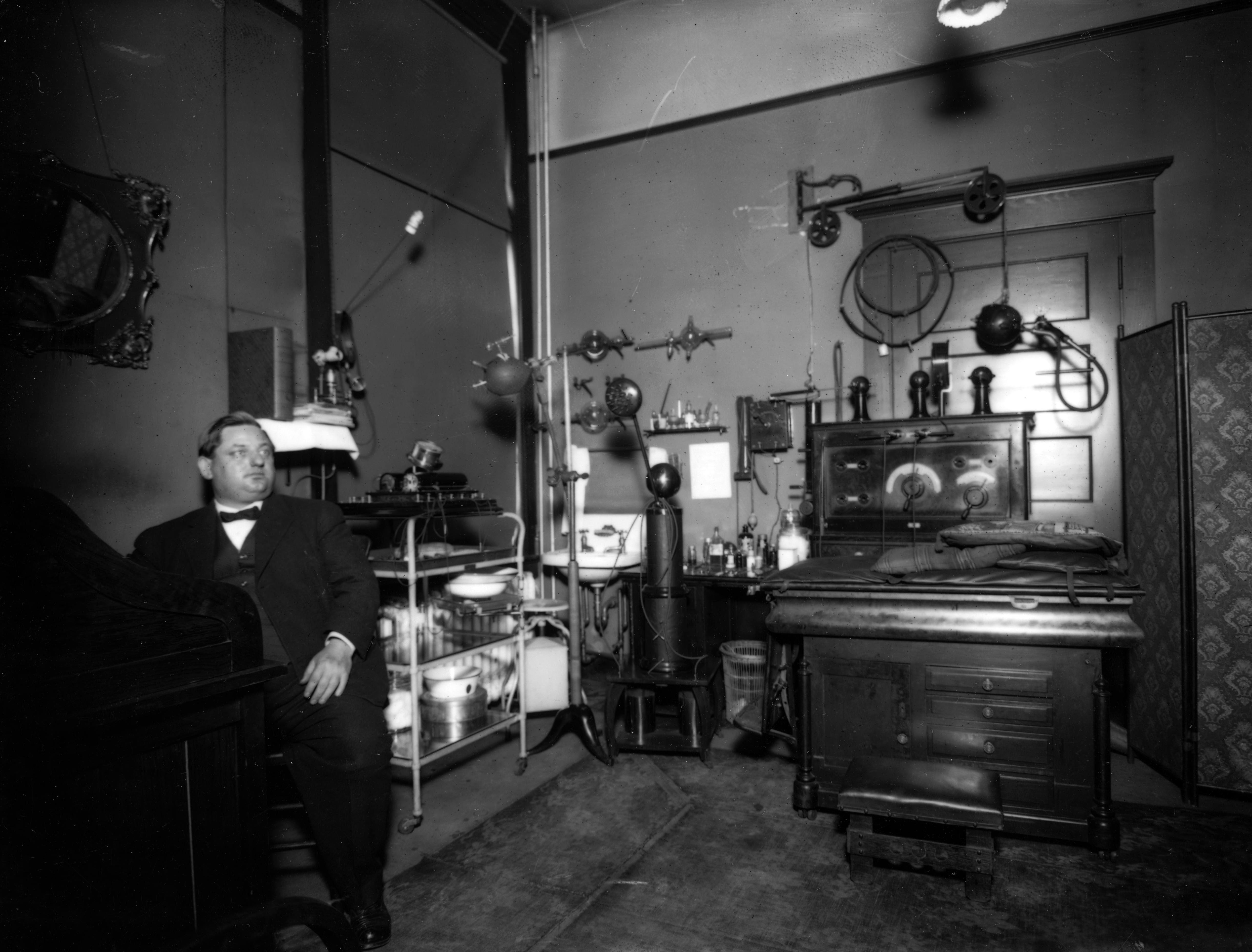 Interior of doctor's office. Judging by other photographs within this collection, this appears to be Dr. C.F. (Charles) Cluthe, the father of the originator of this collection. Dr. Cluthe was a graduate of the Ohio Medical College in Cincinnati and was in practice with his father before moving to Evansville. The office was at 1407 N. Fulton Ave. He was affiliated with the Salt Pool-Fritzlar Mineral Springs (SEE MSS 091-008). He was the medical director of the Germania Maennerchor for years, and died October 11, 1935.