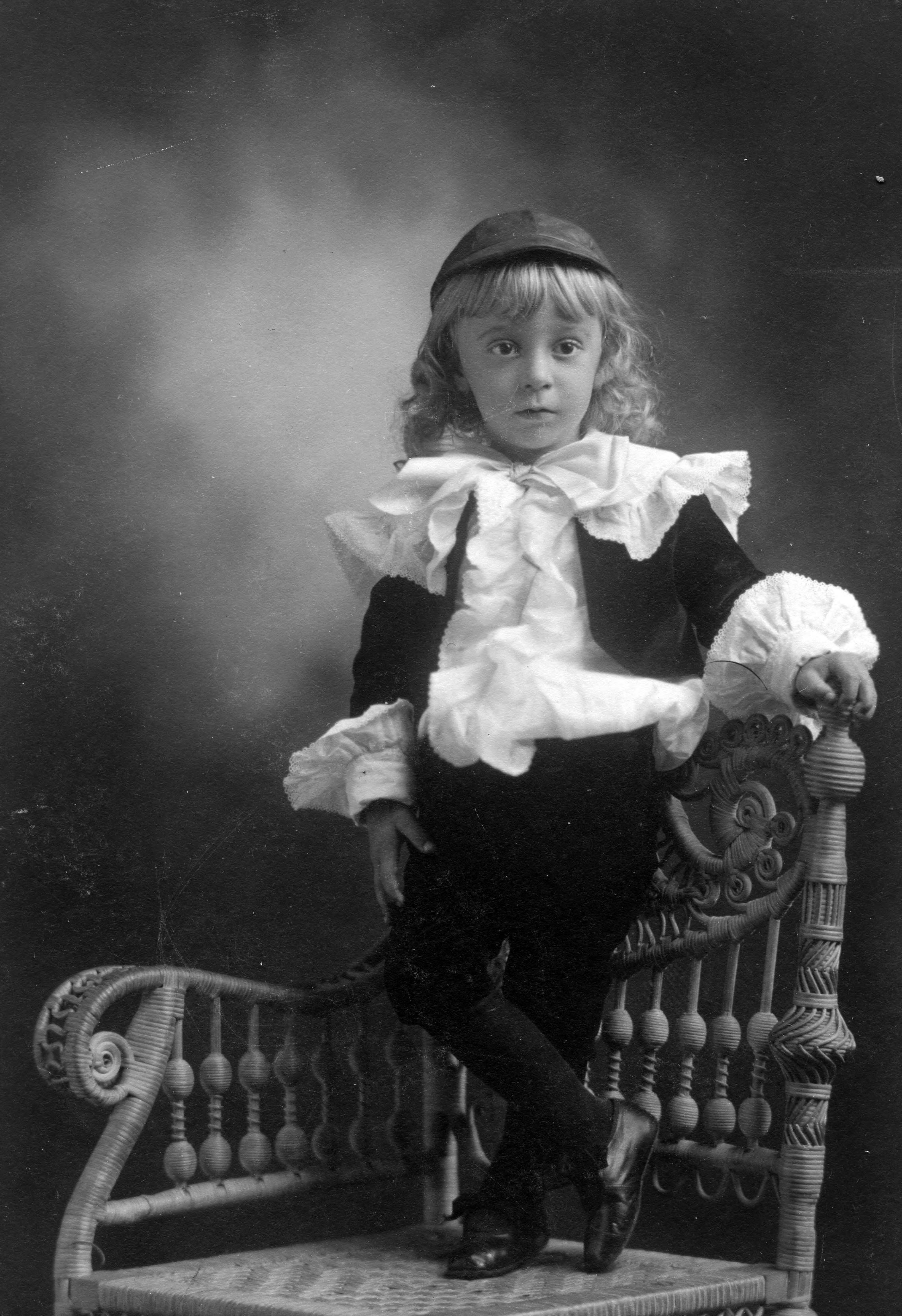 Unidentified little boy, with long blonde curls, and dressed in pants and jacket with a fancy shirt, standing on the seat of a chair. He is wearing a cap. This appears similar to pictures of the Little Lord Fauntleroy style. It is believed that August Illing had family in Little Rock, AR, so this boy might be part of this family, as he is identified as an Illing family relative.
