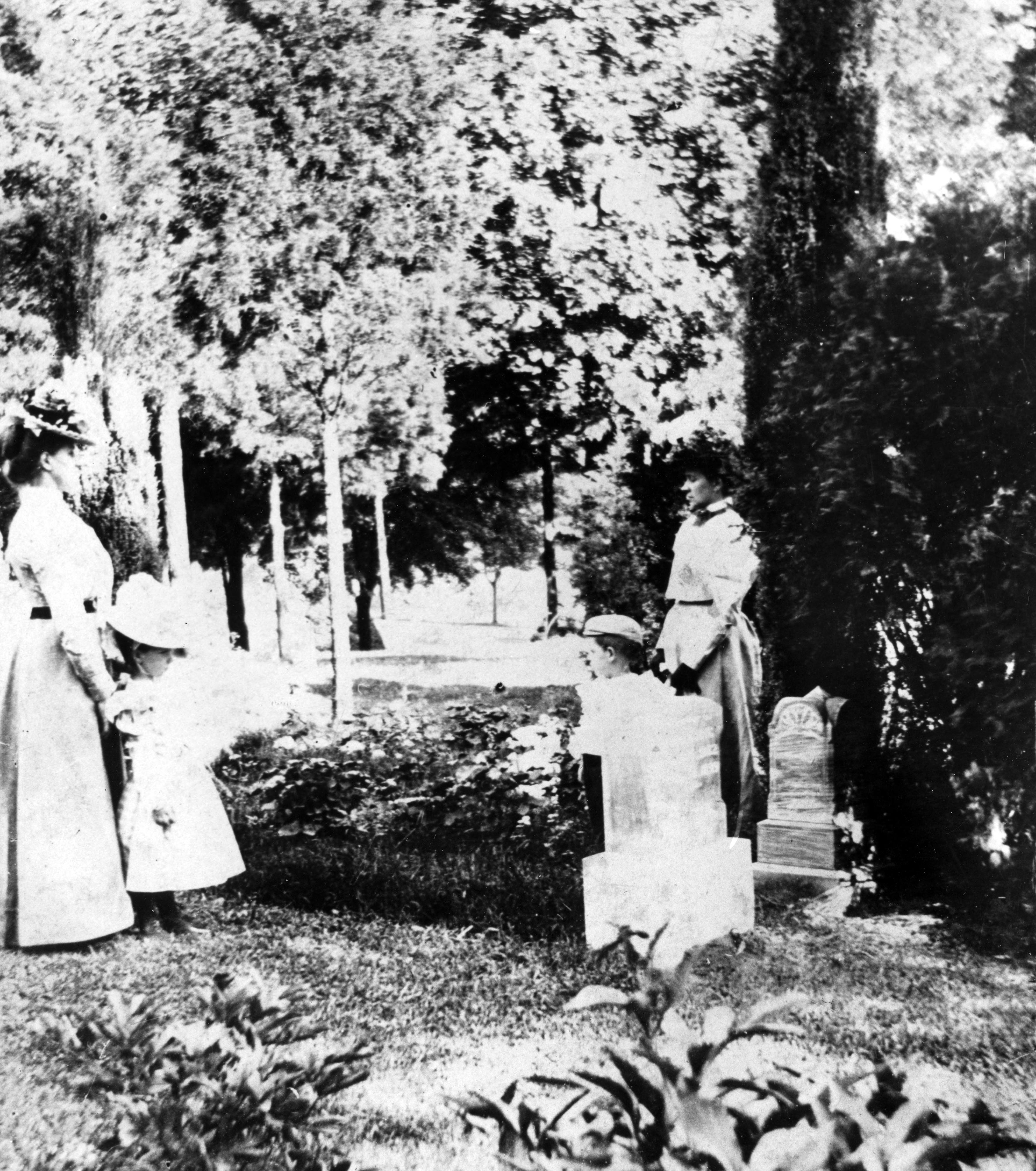 Mrs. C.F. Cluthe (Hulda Illing Cluthe), her daughter, Oramay Cluthe (Eades), and son William August Cluthe at Locust Hill Cemetery. The other woman is not identified. A number of Cluthe and Illing family members are buried at this cemetery, located on Kratzville Rd. Locust Hill Cemetery is a beautiful spot, high on a hill, that at one time was known as Lamasco. This was homestead to a Robert Smith family in 1835. The acreage was later acquired by the Kirkpatrick family. A plot was set aside for a little country cemetery where friends and neighbors of the deceased did the burying. After a few years, the cemetery was deeded to the City of Evansville. (http://historicevansville.com/site.php?id=locusthill)