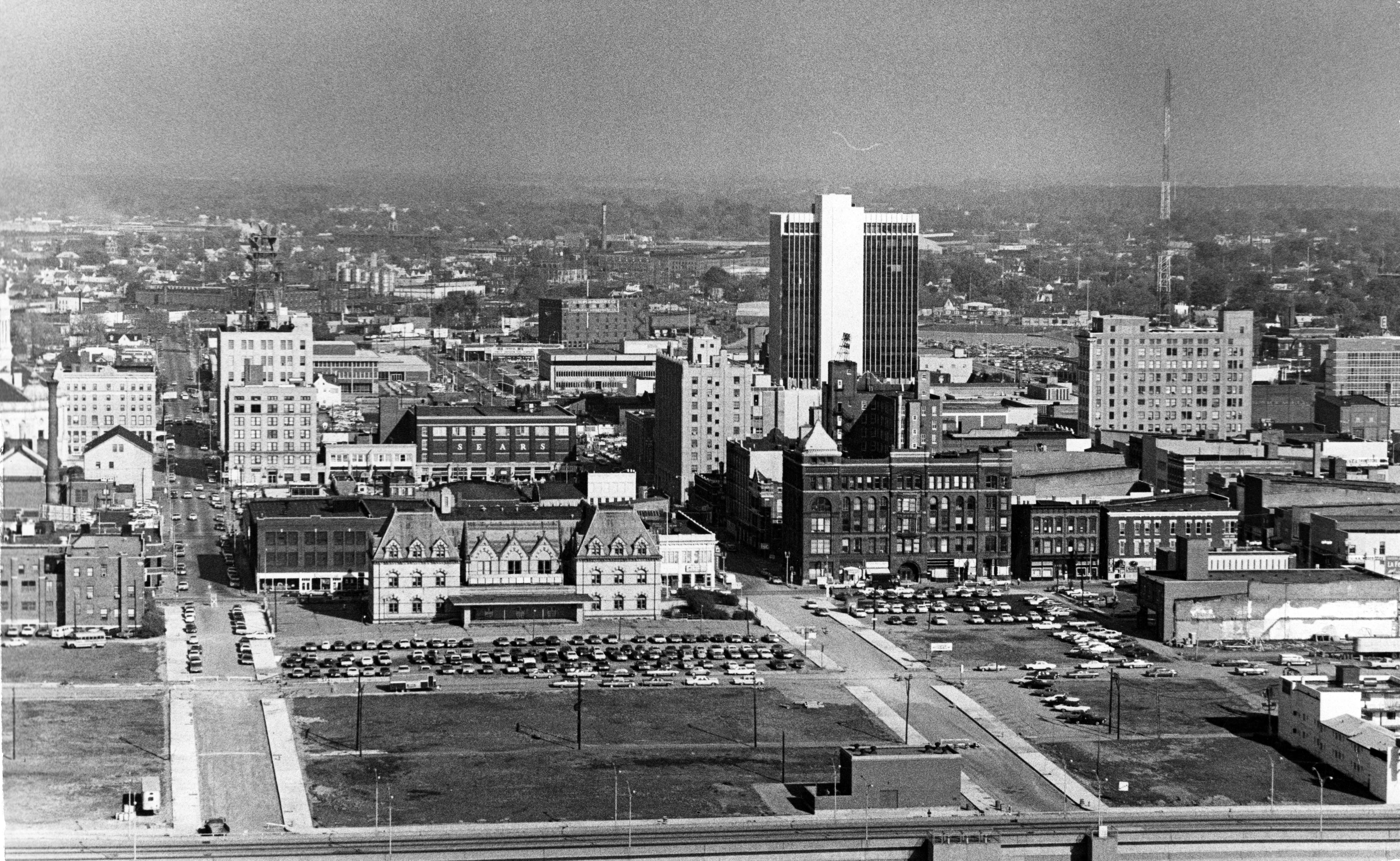 Aerial photograph taken from plane of downtown Evansville, with the old post office at the forefront and the office building at 420 main in the midground; photo gets blurry toward the background.