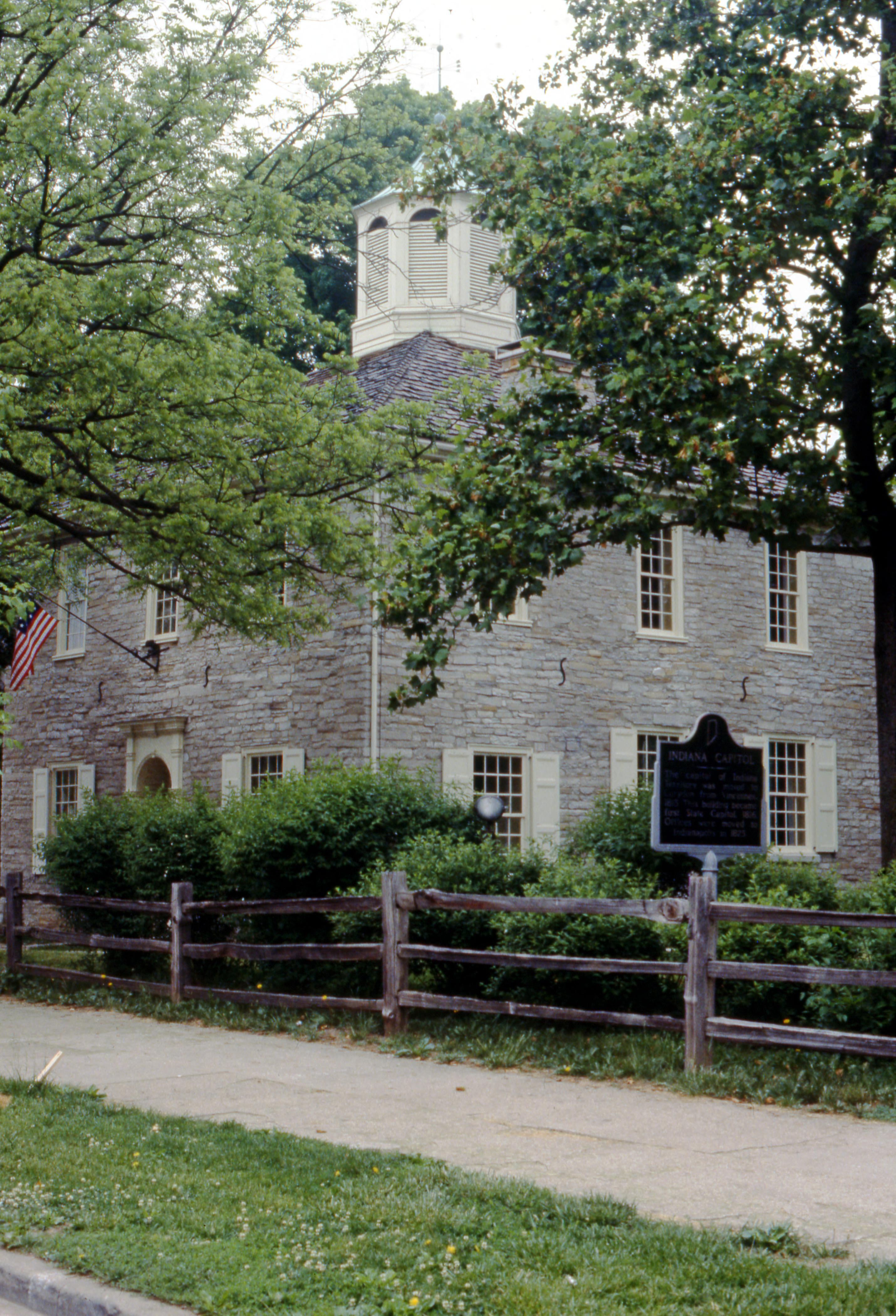 Corydon Capitol State Historic Site commemorates Indiana's first state capital and follows the development of Indiana from a territory to a state. Vincennes, the first territorial capital, was left on Indianas western edge when the Illinois Territory was created, and in 1813, the capital was moved to Corydon, a more central location for Indianas population at the time. In June of 1816, 43 delegates met in Corydon to draft the first state constitution. Much of their work was done under the shade of a large elm tree. The trunk of the tree, now known as Constitution Elm, is still standing. The first state election was on Aug. 5, 1816, in which Jonathan Jennings was elected governor. In November 1816, the first General Assembly of 29 representatives, 10 senators and the lieutenant governor met in the new capitol building. On Dec. 11, 1816, Indiana was formally admitted as the 19th state. Corydon remained the state capital until the government moved to Indianapolis in 1825. The square, Federal-style capitol building, built between 1814 and 1816, is located in the heart of downtown Corydon. Workers hauled limestone from nearby quarries to erect the 40-foot square walls, and logs were cut from virgin forests for the ceiling and roof supports. After the government moved to Indianapolis, the building was used as the Harrison County Courthouse. When the present courthouse was completed in 1929, the old capitol building was restored and opened as a state memorial in 1930. (https://www.indianamuseum.org/corydon-capitol-state-historic-site)