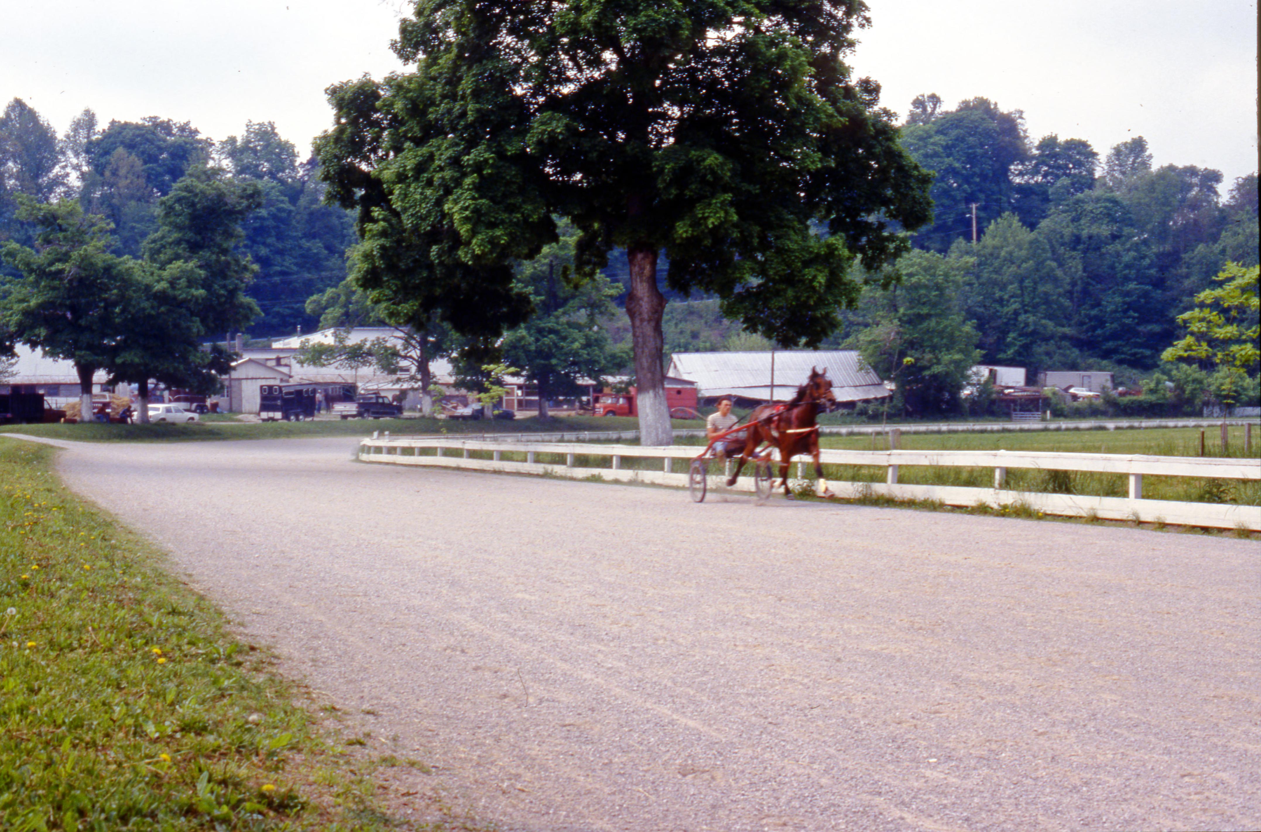 Man in sulky driving a horse on a racetrack---although positive identification is not possible, this is probably the Harrison County fairgrounds at 341 S. Capitol Ave. The fairgrounds are known to host harness racing.