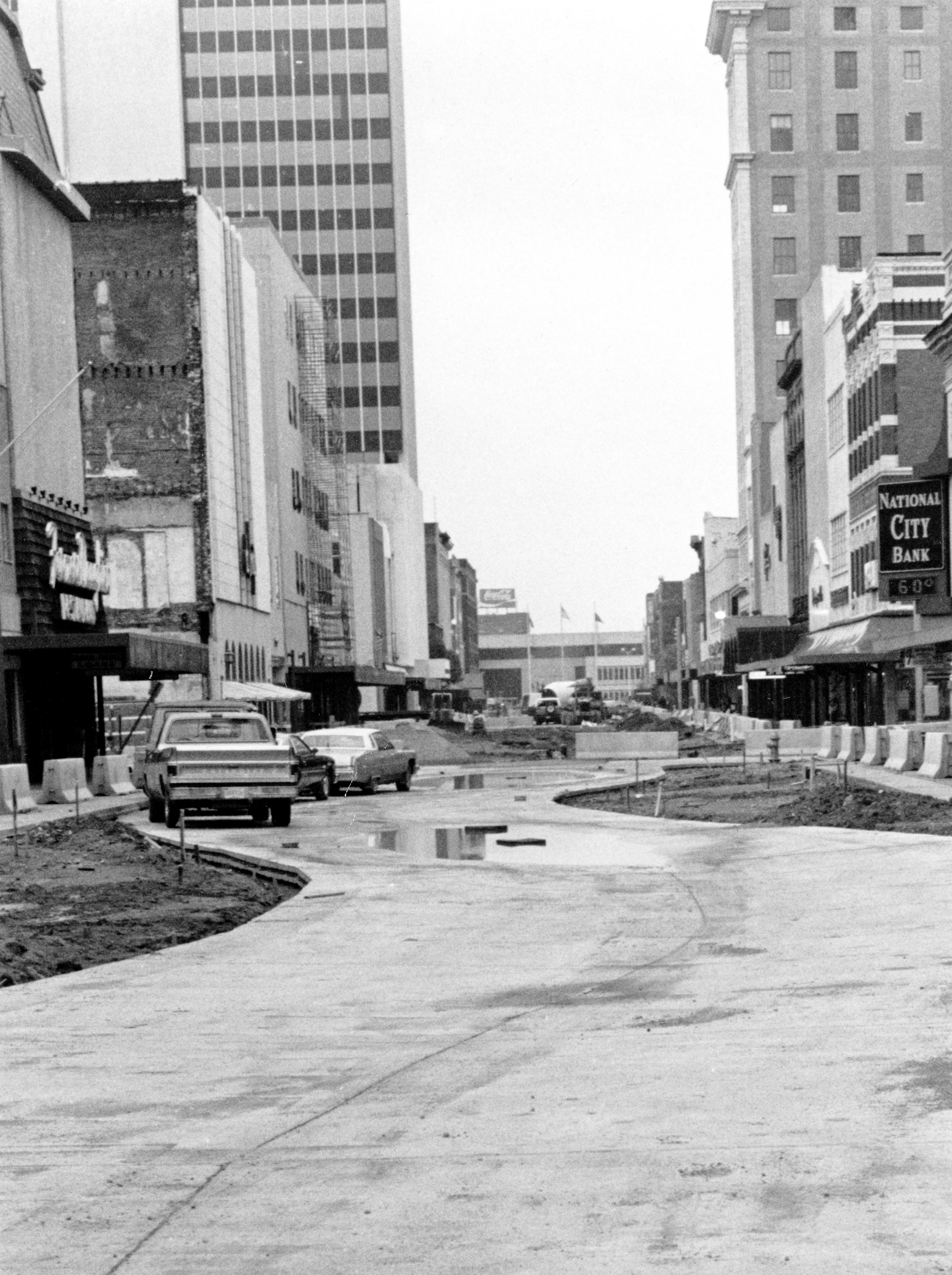Construction on Main St. near the corner with 3rd St. Closed to all but pedestrian traffic in the 1960s, Main St. reopened to one way vehicular traffic in 2002. On the left is the Farmer's Daughter restaurant at 228-230 Main St. The building dates to 1857, making it one of Evansville's oldest. Originally known as the Washington Hotel, its basement was said to be part of the Underground Railroad, a network secret locations which housed enslaved people after they escaped and pursued freedom. It was a clothing store and haberdashery for awhile, and the well-known Farmer's Daughter restaurant started its three-decade run in the early 1960s. Loft apartments were created on upper floors during former Mayor Jonathan Weinzapfel's administration. (http://archive.courierpress.com/business/old-farmers-daughter-building-to-have-new-restaurant-unique-purpose-23ce4d78-e15e-7f05-e053-0100007f-342172031.html/) In 2017 or 2018 a new restaurant opened in this location, with the building completely restored. The tall building further down Main St. on this side is Old National Bank at 420 Main St. That bank opened in this location in 1970, although as it business it opened in 1835 and was renamed Old National in 1883. This building still stands, but the bank has its headquarters elsewhere. Across Main St. is the sign for National City Bank at 227-229 Main St. Virtually none of this can be seen in this picture, but the bank moved to this location in 1914 and was renamed National City in 1922. This was the site of the original Vanderburgh County courthouse. The building still stands, but the bank no longer exists. Finally, the tall building on this side is the 1916 construction at 329-331 Main St., Citizens National Bank at the time of this photograph. The sign on the building today says Hilliard Lyons after the subsequent tenant, but today it is occupied by another business.