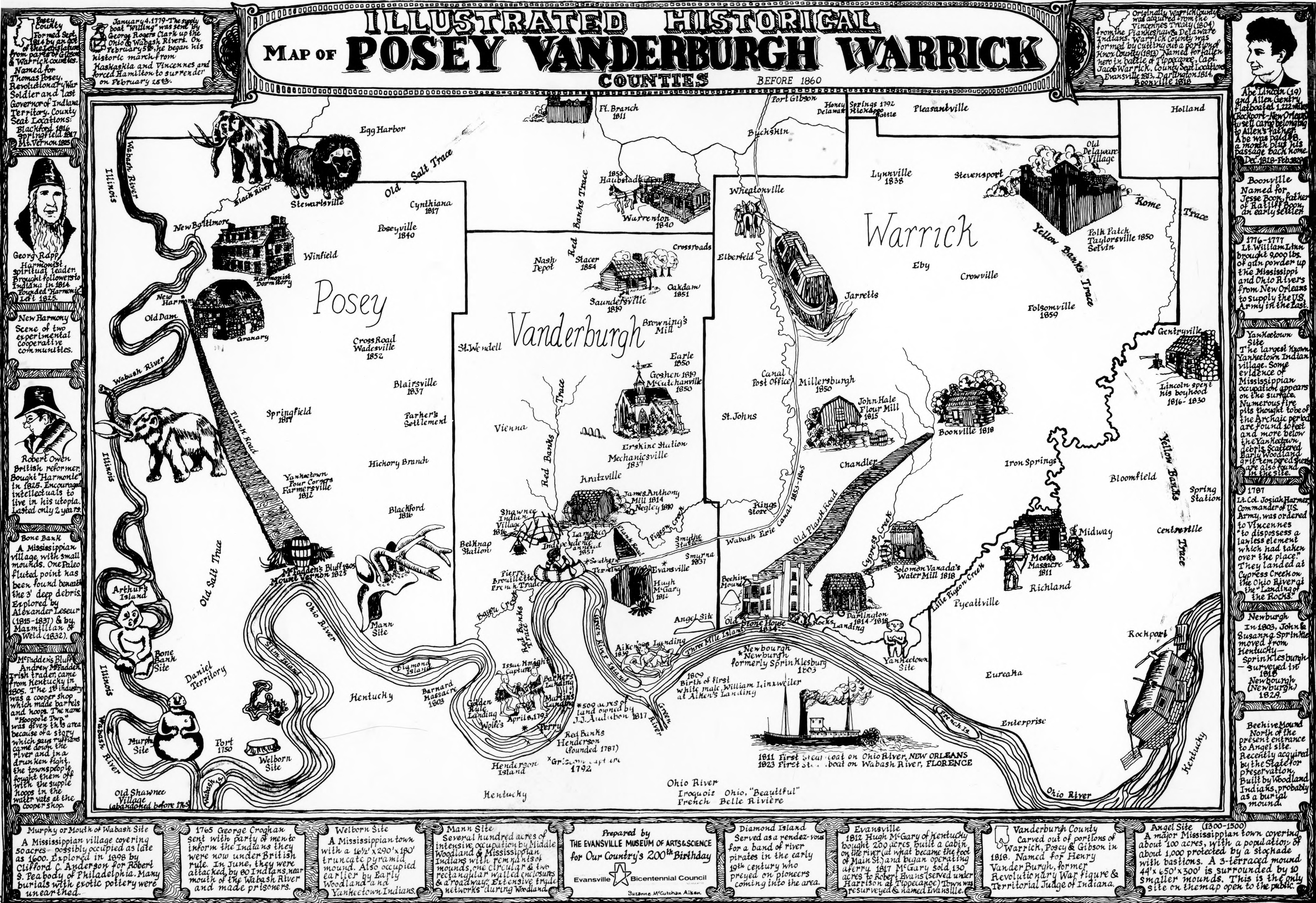Illustrated historical map of Posey, Vanderburgh, and Warrick counties before 1860.