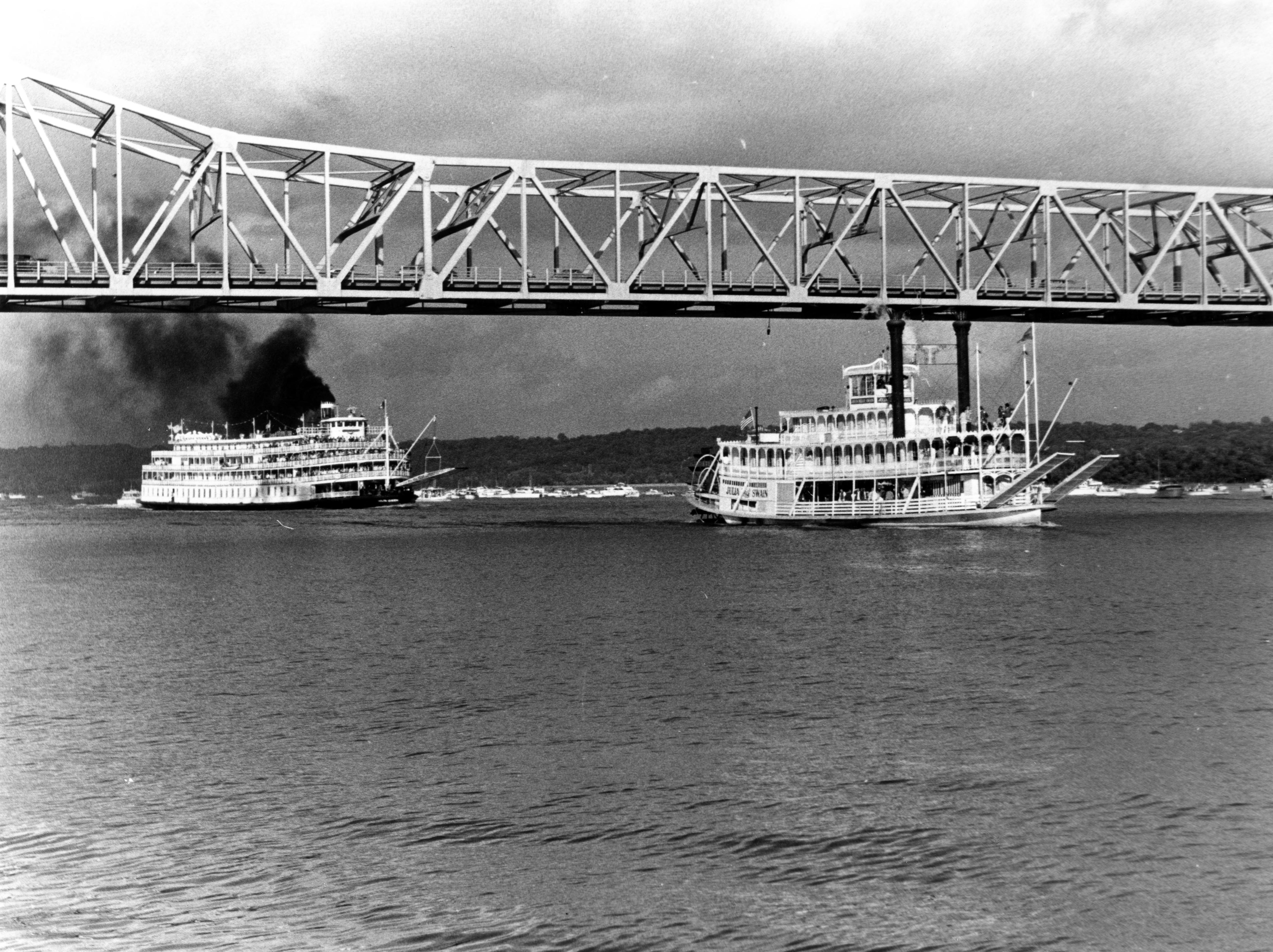 Steamboats Delta Queen and Julia Belle Swain in steamboat race in Peoria Illinois. Winner of race was Julia Belle Swain. This appears to be the Murray Baker Bridge on I-74 as it crosses the Illinois River right before it empties into Peoria Lake.