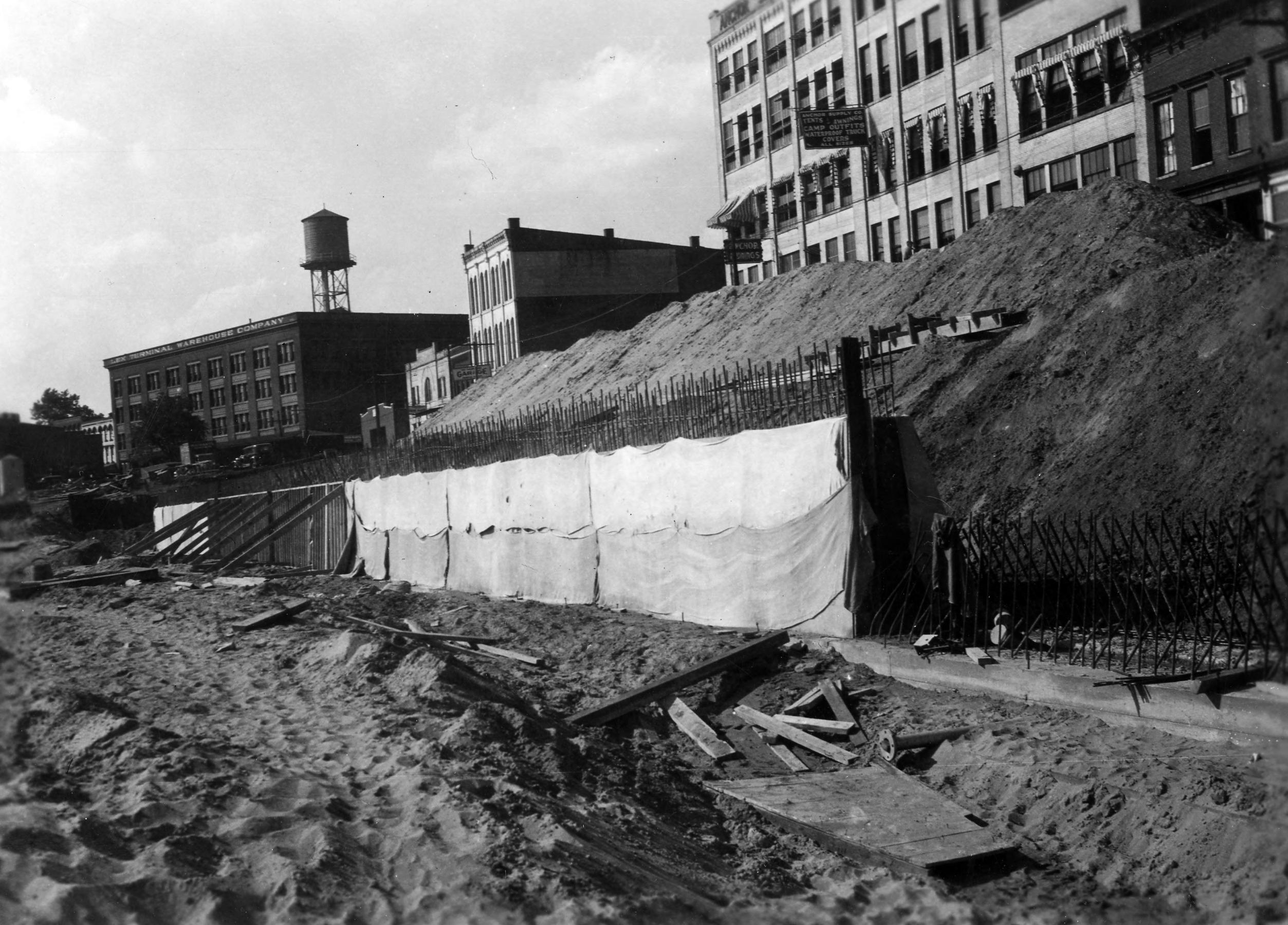 Riverside Drive wharf and riverfront construction, construction of Dress Plaza. Identifiable above on Riverside Dr. is Lex Terminal Warehouse Company (left, at 2-16 Ingle St.) and Anchor Supply Co. 121 NW at Riverside Dr. Built in 1908 (although the business pre-dates this by about 10 years), the building was expanded circa 1920. It was heavily damaged in the 1937 flood and rebuilt, then razed 1969 or 1970.