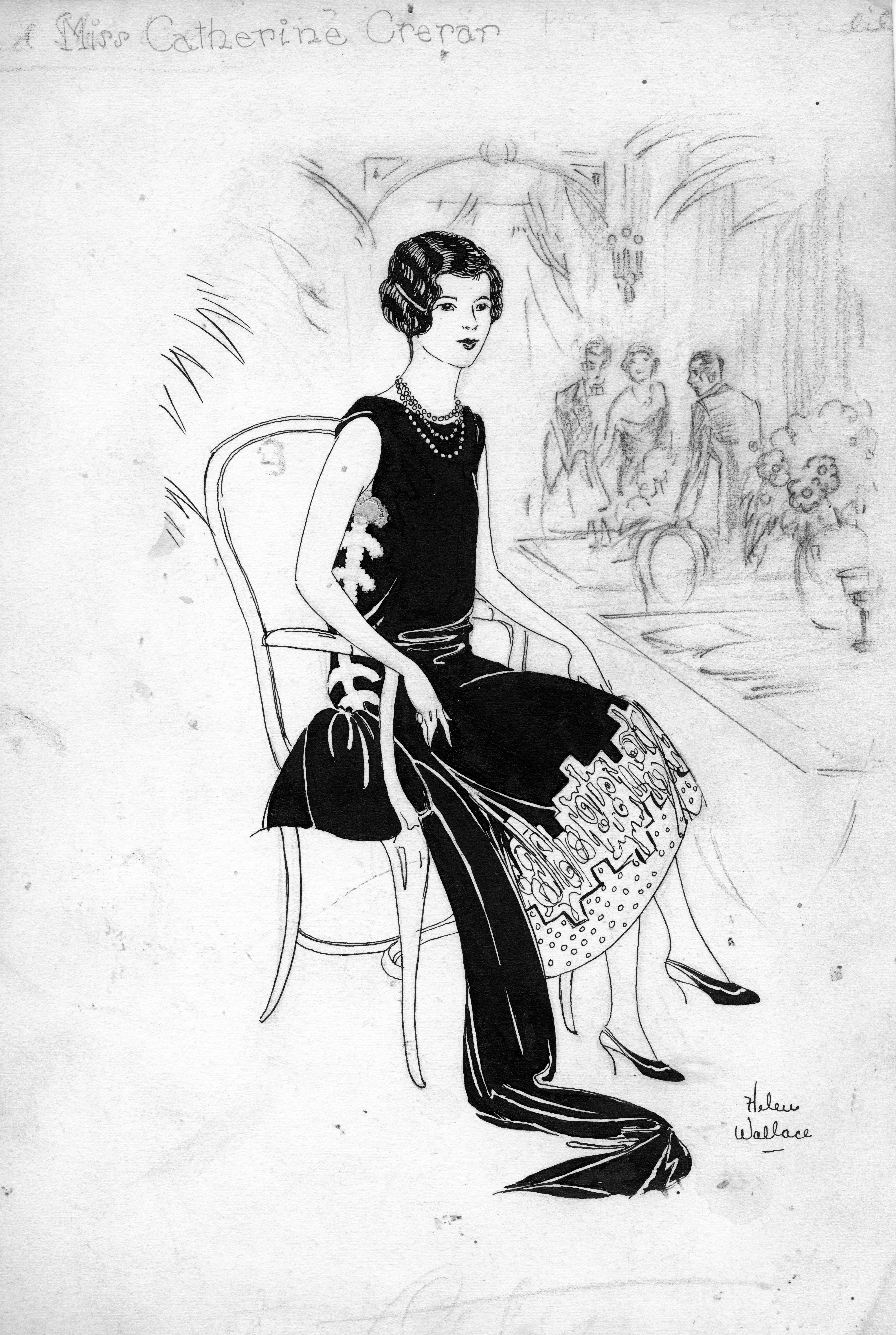Pen and pencil sketch of a young woman, Miss Catherine Crerar, with Marcelled hair wearing a dress that had a long bow in the back. The background gives the impression of a dinner celebration. The Chicago Tribune for January 15, 1927, carried an announcement of her wedding to Ralph Chester Otis, Jr.