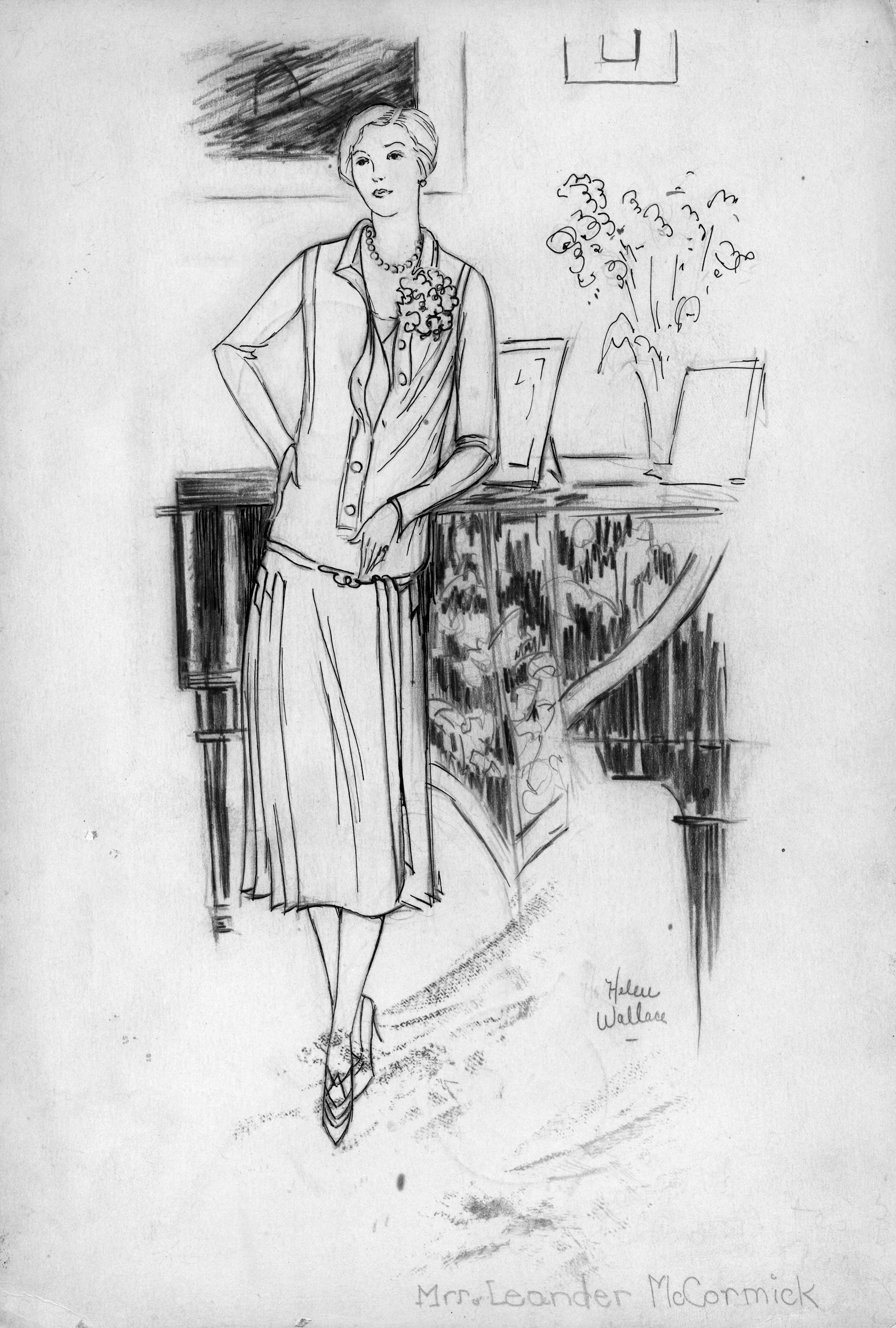 Pencil and drawing of a woman identified as Mrs. Leander McCormick, leaning against a piano. There were several generations of Leander McCormicks involved with International Harvester. The most likely, age wise, was Leander Julius (1882-1946), but no information was found about a spouse in his Find-a-Grave listing. However, the Oct. 8, 1917 Chicago Tribune carried an engagement announcement for Leander J. McCormick and Alice Cudahy.