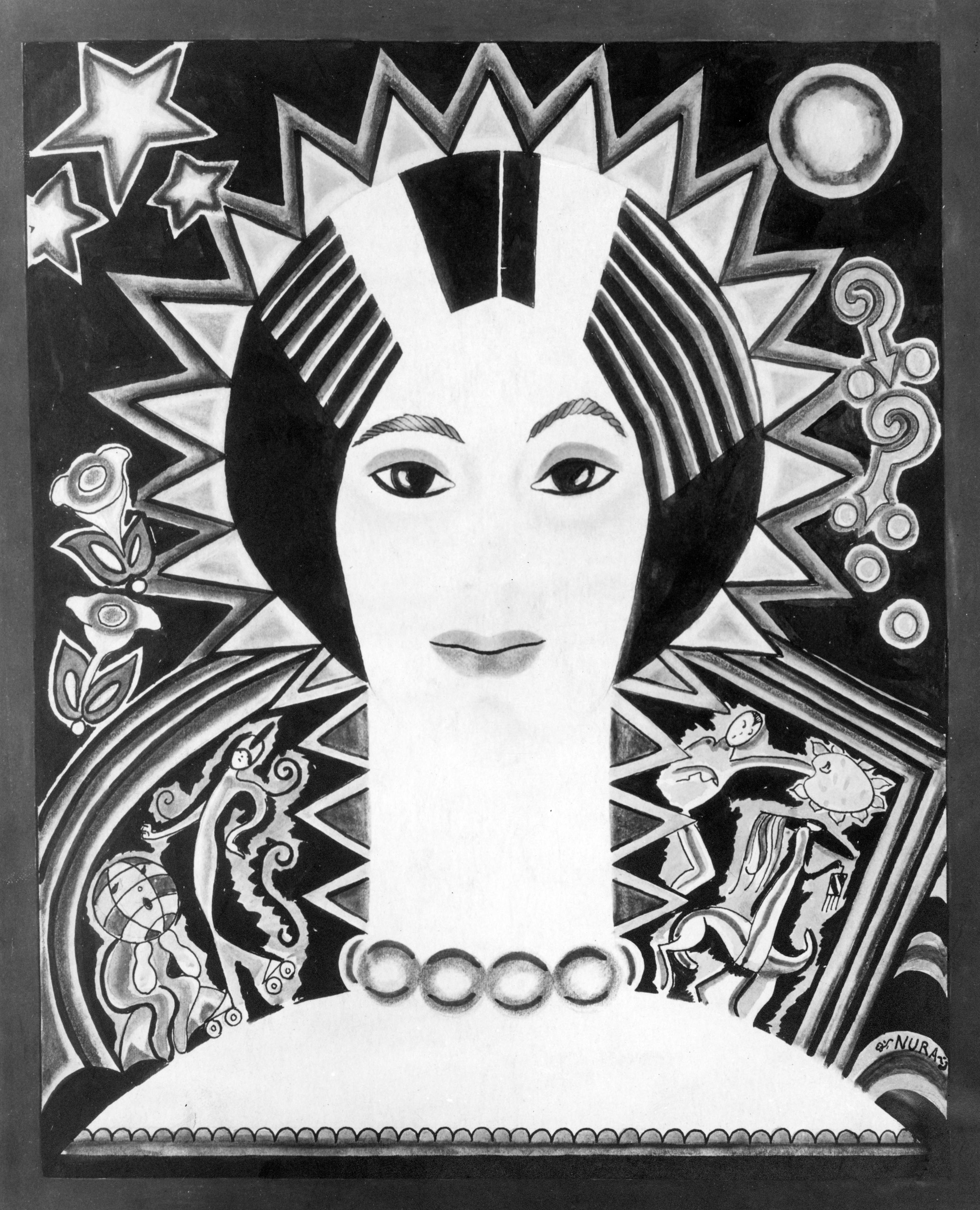 Stylized drawing of a woman with a turban and a choker made of circles around her neck. The background contains stars, flowers, the globe, the rays of the sun, and other images. In the bottom right corner it says NURA.