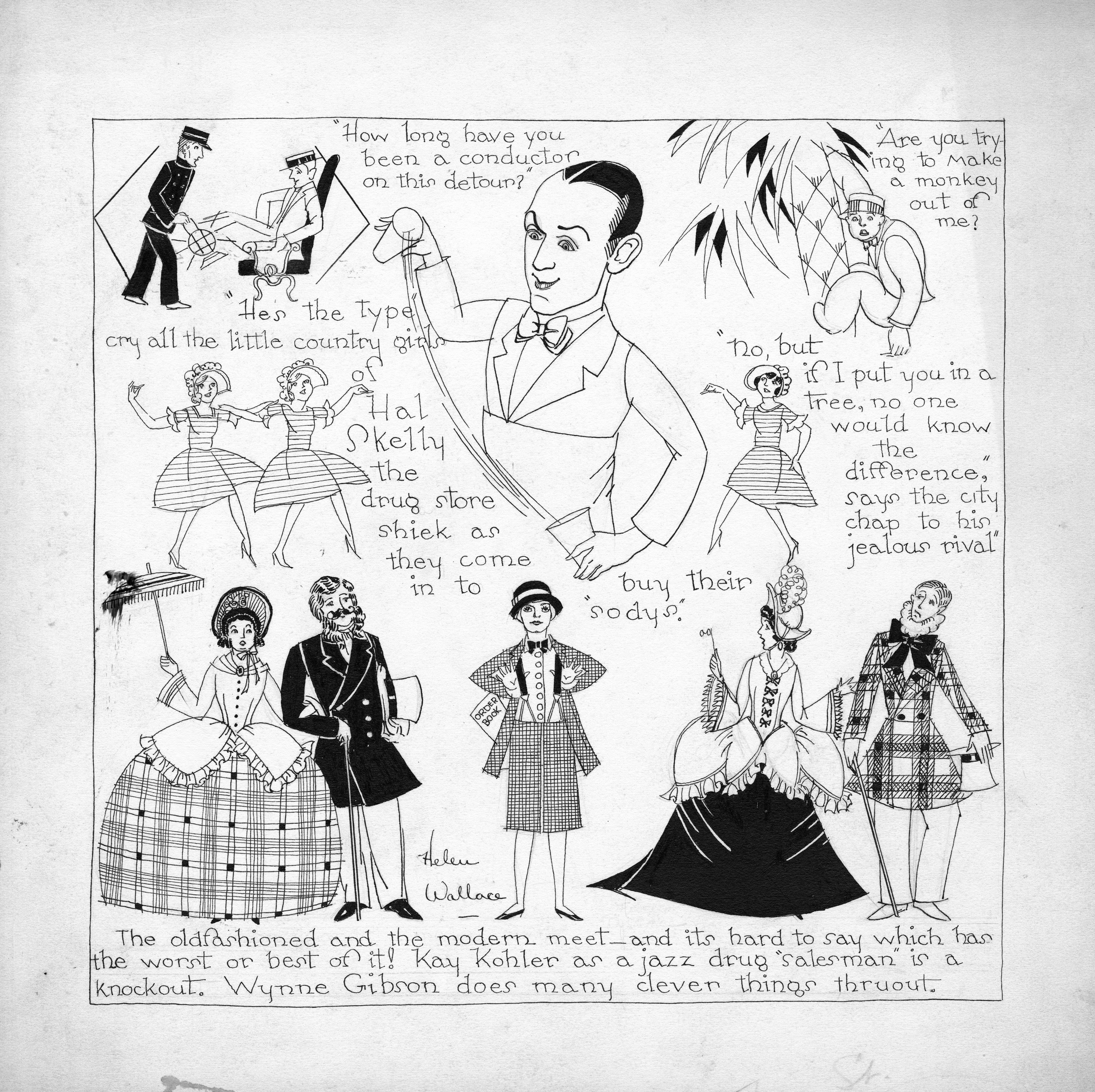 Pen sketches for an unnamed production with Hal Skelly, Kay Kohler, and Wynne Gibson. It is stamped with a 1926 date on the back. All 3 actors were in a the post Broadway tour of a 1925 Jerome Kern musical called The City Chap, and it is believed that this is the production that is advertised here.